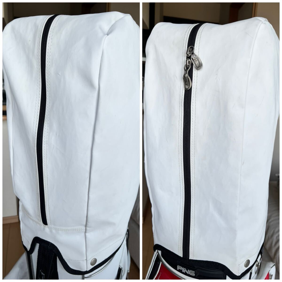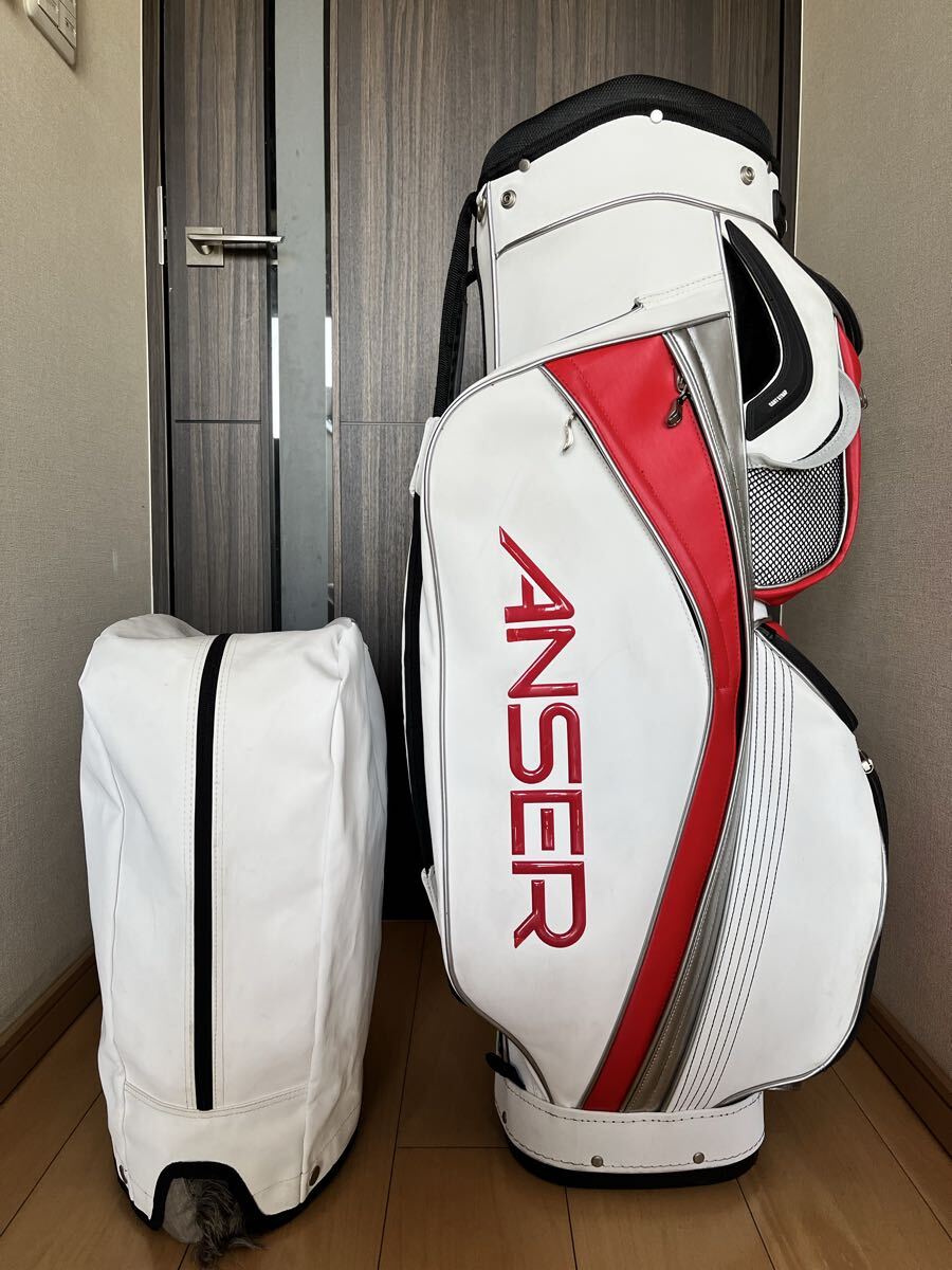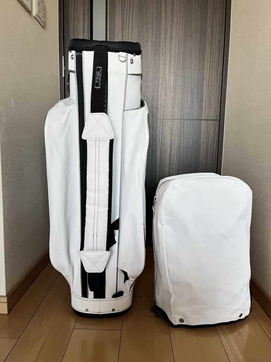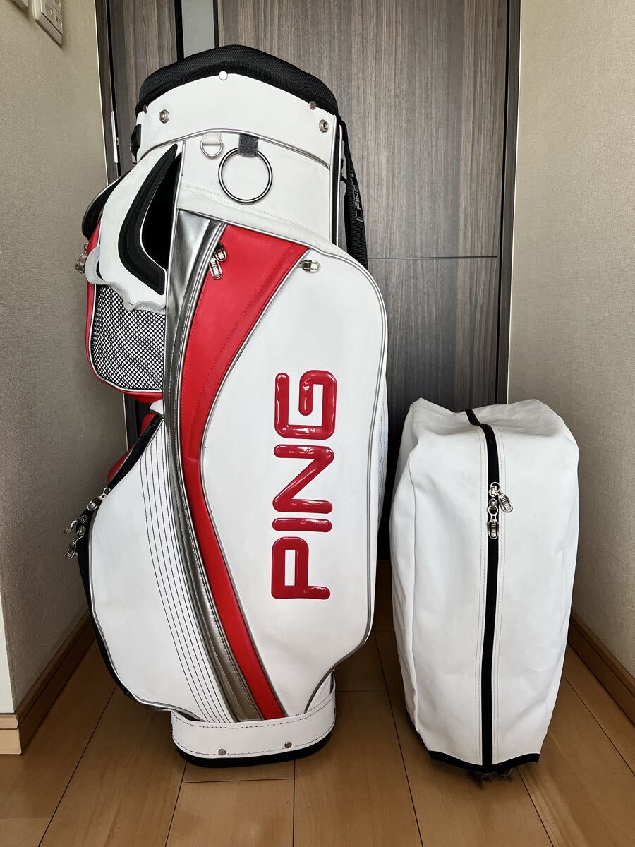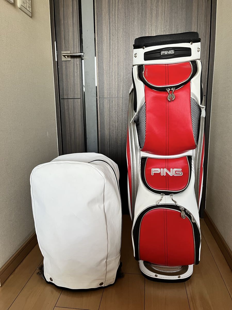 PING ANSER アンサー カートキャディバッグ、ホワイトとレッドの合成皮革製で多機能ポケット付き。