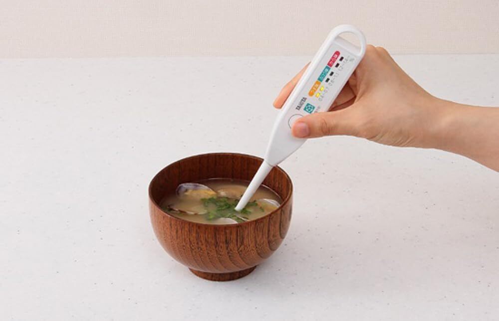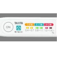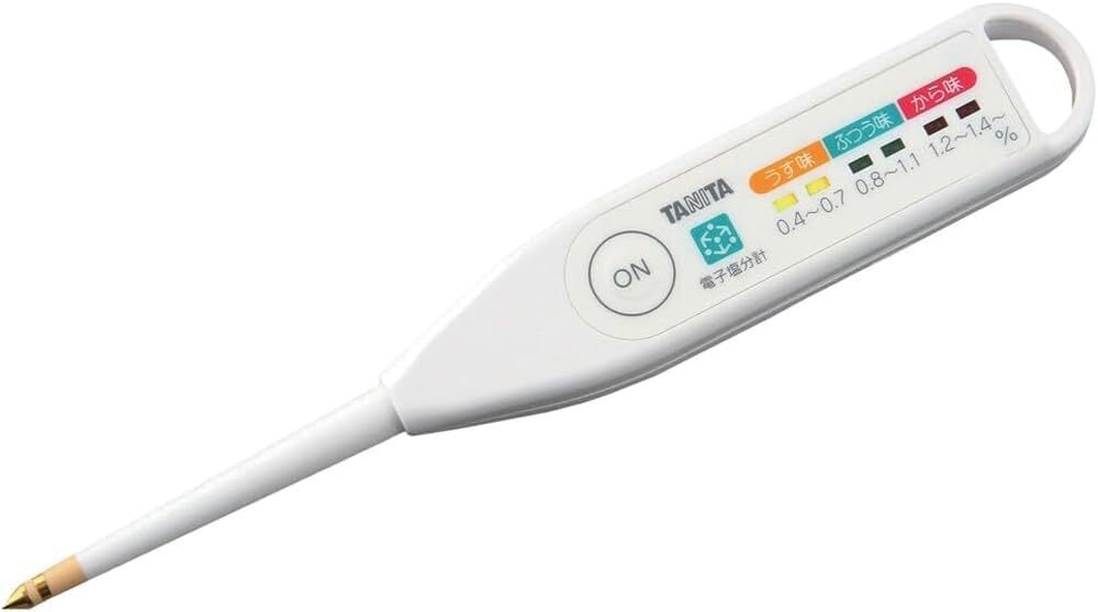 | ■■■■■■■■■■■□□□■■■■■■■■■■■□□□■■■■■■■■■■■□□□■■■■■■■■■■■□□□ (^-^*)/★私のオークションにようこそ★(^-^*)/ 未開封新品でございます。 外箱少し痛みありますが奇麗に梱包致しまして発送いたします。 塩分量が手軽にわかる電子塩分計 うす味、ふつう味、から味を3色のLED6点で見やすく表示 30~90度までの範囲が測定可能(自動温度補正機能付き) 塩分に気をつけなければならない方や、減塩を心がけている方、減塩をサポートしている方にオススメ 電池寿命:約6ヵ月(1回5回使用) ※先端部・センサー部は食品衛生法に適合しています 塩分をチェック 血圧が高いのが気になる。。。 健康診断でひっかかった。。。塩分濃度がひと目でわかる簡単測定 ボタンを押し続けた状態でセンサー部が完全に浸かるまで入れる (ボタンは測定表示を確認するまで約5秒間押し続けます)3区分・6段階でLED表示 うす味、ふつう味、から味を3色のLED6点で見やすく表示 塩分に気をつけなければならない方や、減塩を心がけている方、減塩をサポートしている方にオススメBPAフリー 食品に触れるセンサー部分には、摂取すると人体の内部分泌系に影響を及ぼす可能性があるといわれているビスフェノールAを含まない素材を使用生活防水設計で水回りでも IPX4(※)相当の生活防水なので、キッチンなどの水回りでもお使いいただける ※あらゆる方向からの水の飛沫によっても、性能に影響を及ぼす程度の水の侵入がないもの。丸洗いはできません
