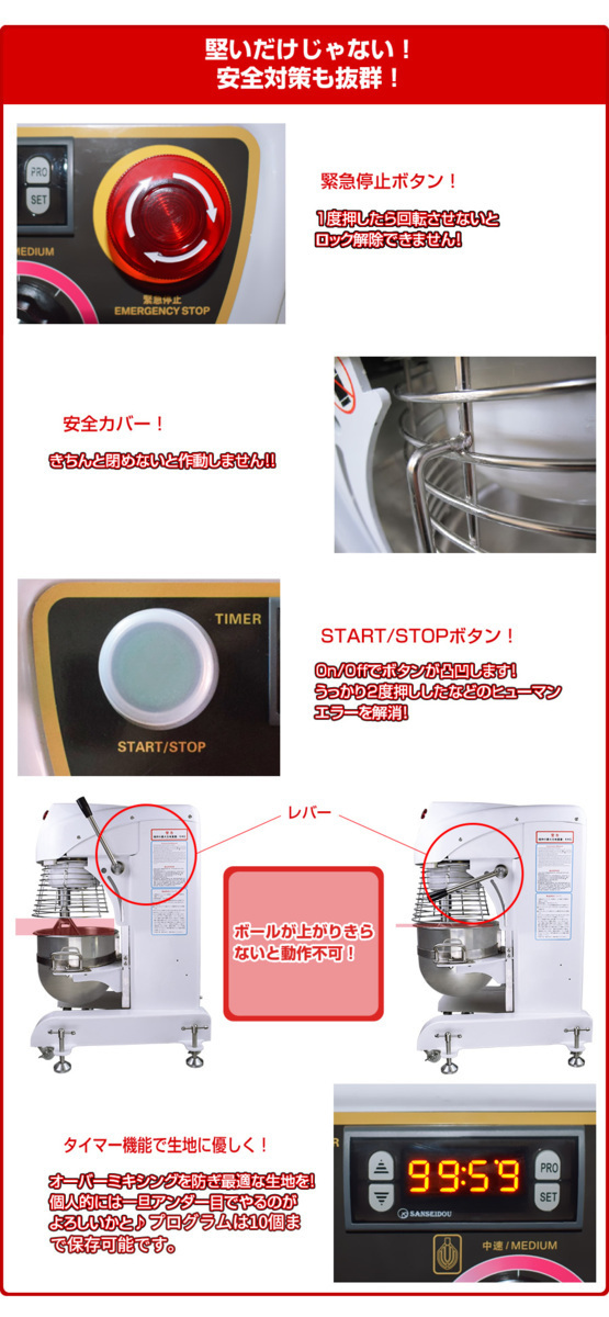 ※加水率の低い生地やピサ生地等はスパイラルミキサーをご使用下さい。