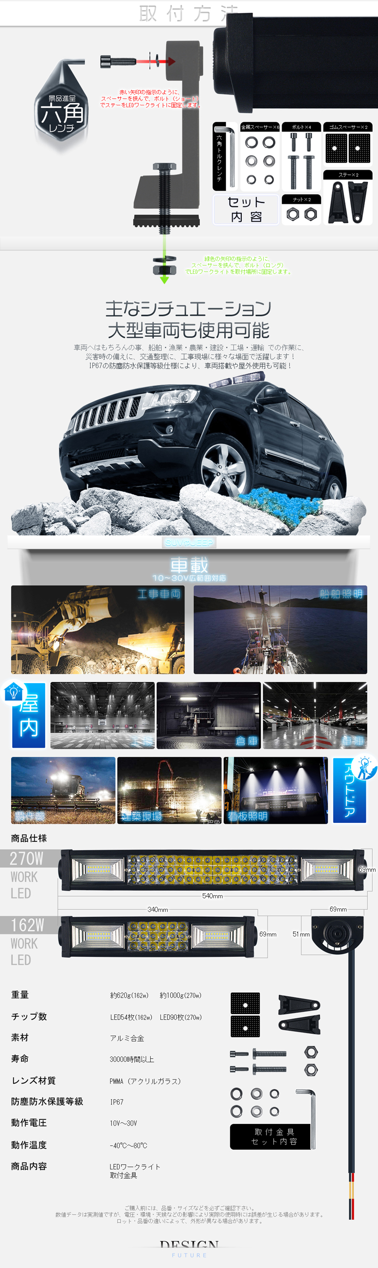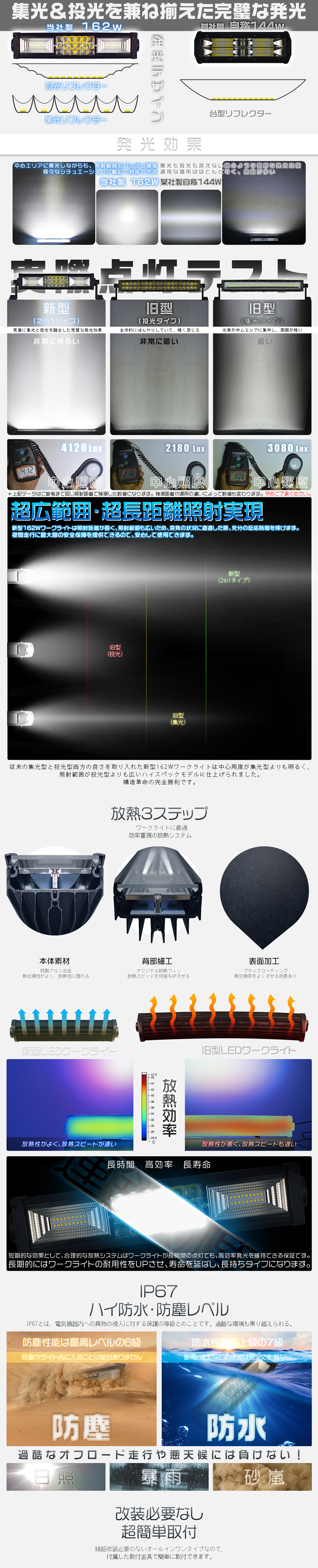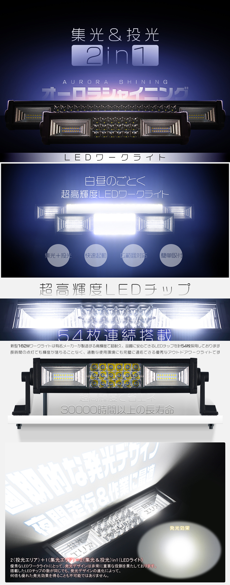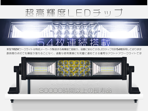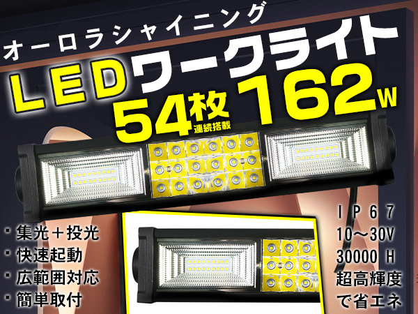 | オーロラシャイニング 162W チップ54枚連続搭載 集光&投光両立 車載/屋外照明 漁業用、農業機械、建設機械、工程機械、自動車がバックライト等の作業に、災害時の備えに、交通整理に、工事現場に様々な場面で活躍できます!