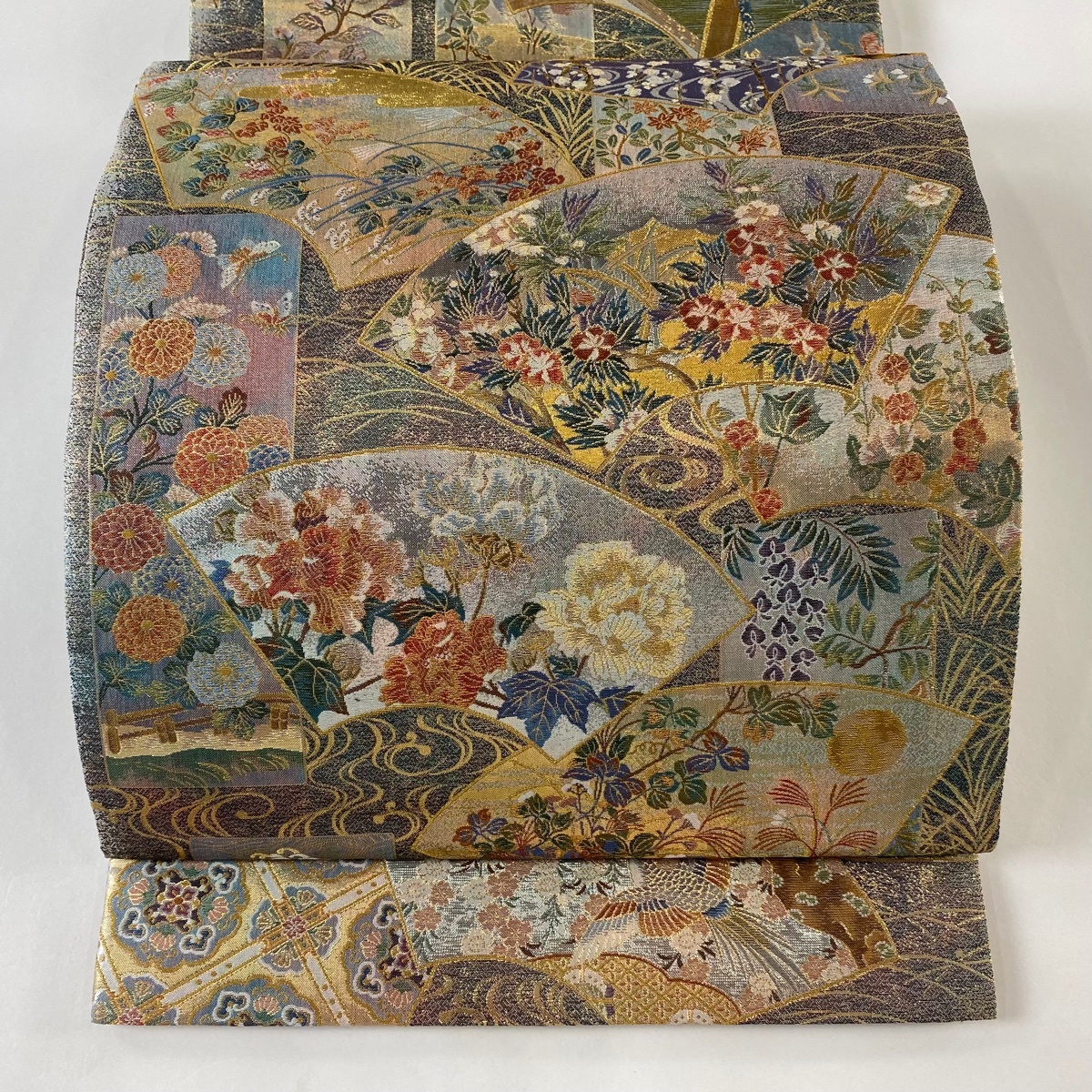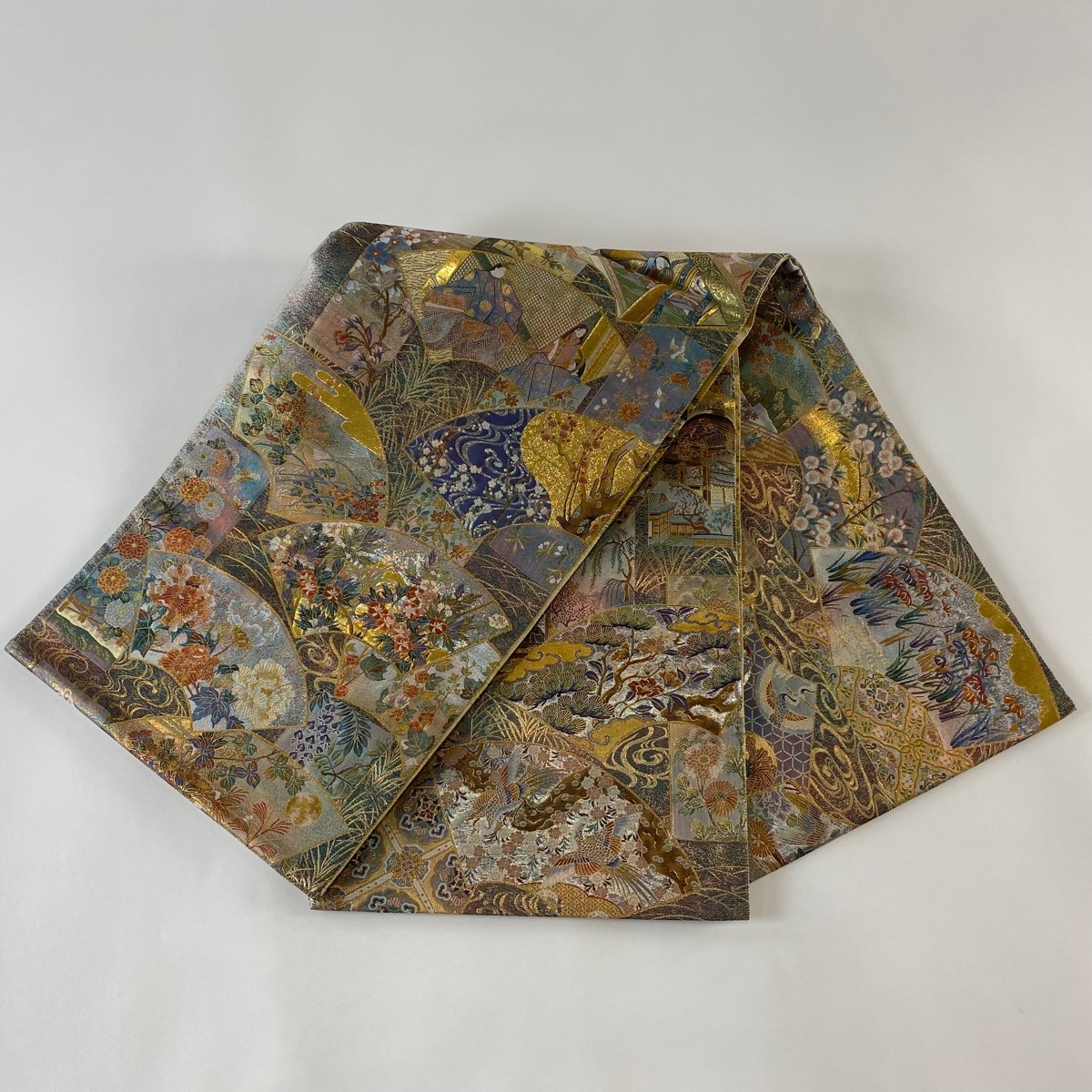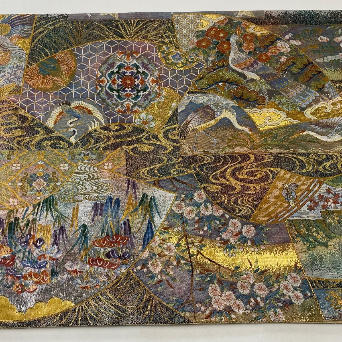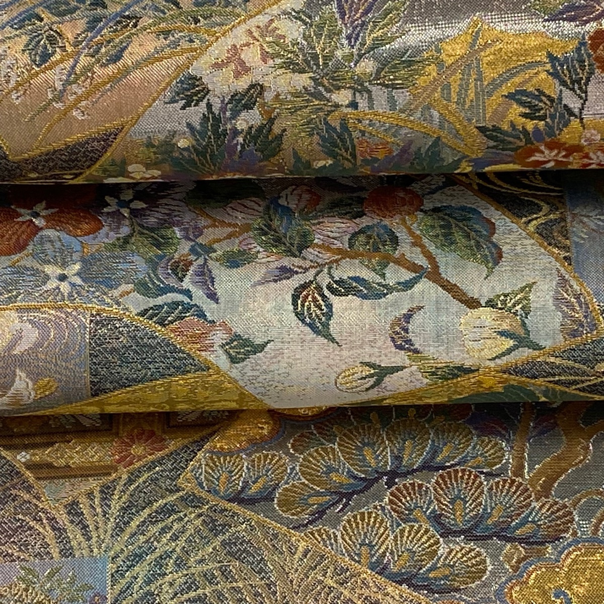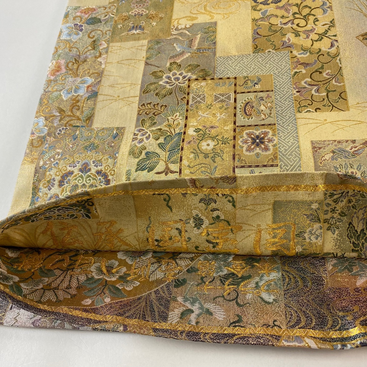 | 丸帯 美品 逸品 壱阡八百口織 伝承国宝図 金糸 プラチナ本金箔 青緑 全通 正絹 【中古】 |