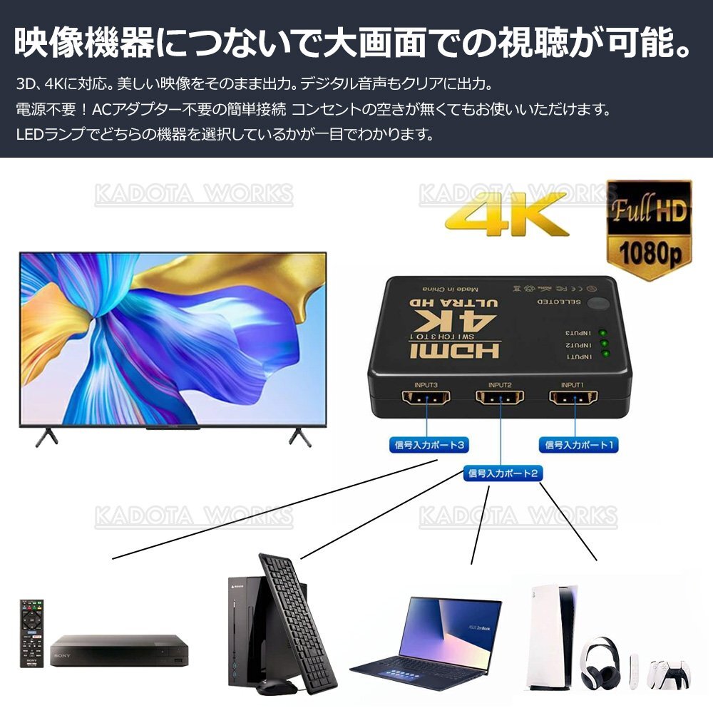 3台のHDMI機器の映像・音声を切り替えて1台のテレビやプロジェクター等へ出力できます。