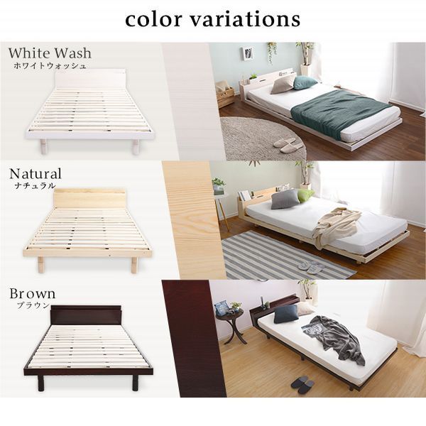 【ポイント】 お好みに合わせて3段階に高さを調節できる宮セット脚付きベッドです。 北欧産パインフレームを使用した、通気性と耐久性に優れた頑丈設計です。 やさしい無垢材のナチュラル、爽やかなホワイトアッシュ、シックなブラウンの3色がございます。 低ホルムアルデヒド仕様で、F★★★★(フォースター)獲得!お子様にも安心です。 |