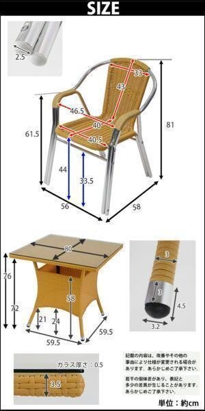 | 商品サイズ | ■本体:チェア:約W56x約D58x約H81(cm) ■本体:座面までの高さ…約44(cm) ■本体:テーブル:約W80x約D80x約H76(cm) |