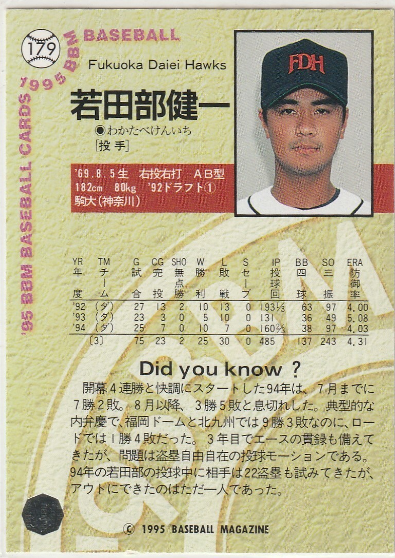 ●1995BBM【若田部 健一】ゴールドサインパラレル No.179:ホークス R