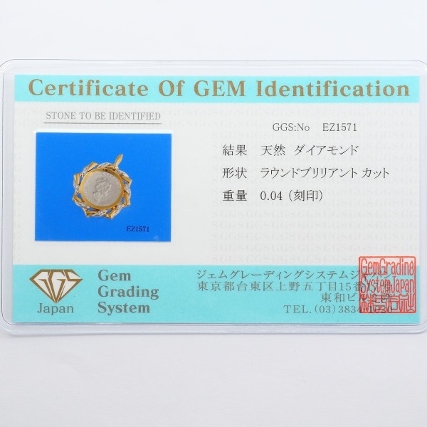 | 【素材】 PT1000/プラチナ PT900/プラチナ K18/イエローゴールド 【石目】 天然ダイアモンド 0.04ct 【総重量】 約6.6g 【サイズ】 約 29mm×24mm バチカン内径:約 4mm×2mm 【付属品】 カード式鑑別書(ジェムグレーディングシステムジャパン) 【商品の状態】 コインは目減り防止の為未研磨/枠は新品仕上げ済み 【コメント】メイプルリーフのプラチナコインを嵌めたペンダントトップです。コインの絵柄をより魅力的に映えさせる枠のデザインは、シャープでありつつも柔らかで荘厳な雰囲気を醸し出しています。そっと添えられたダイヤが煌めくたびに、人々を惹きつけてやまないお品となっています。 | |