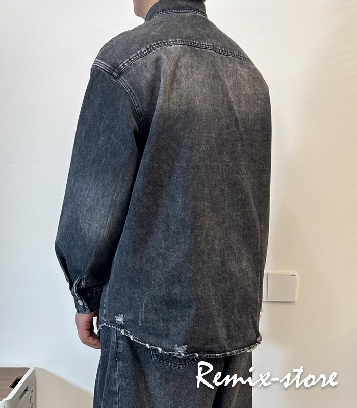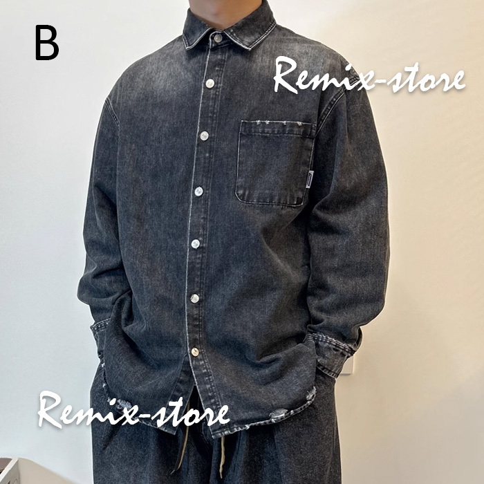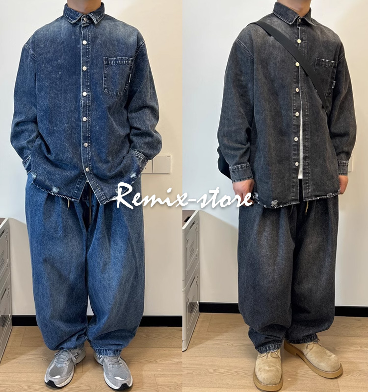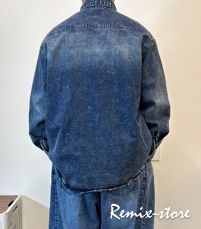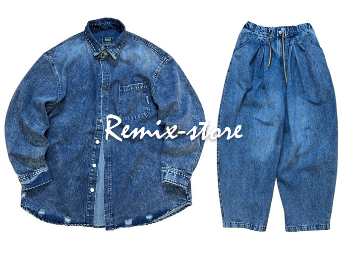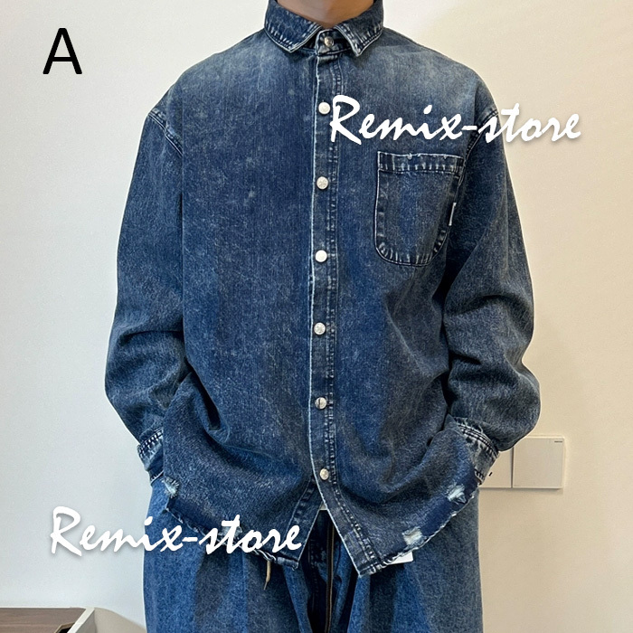 ★かっこいい ワーキング ブリーチ デニムシャツ&パンツ セットアップ 2色展開 M~2XL トラックパンツ オーバーサイズ 大きいサイズ★489