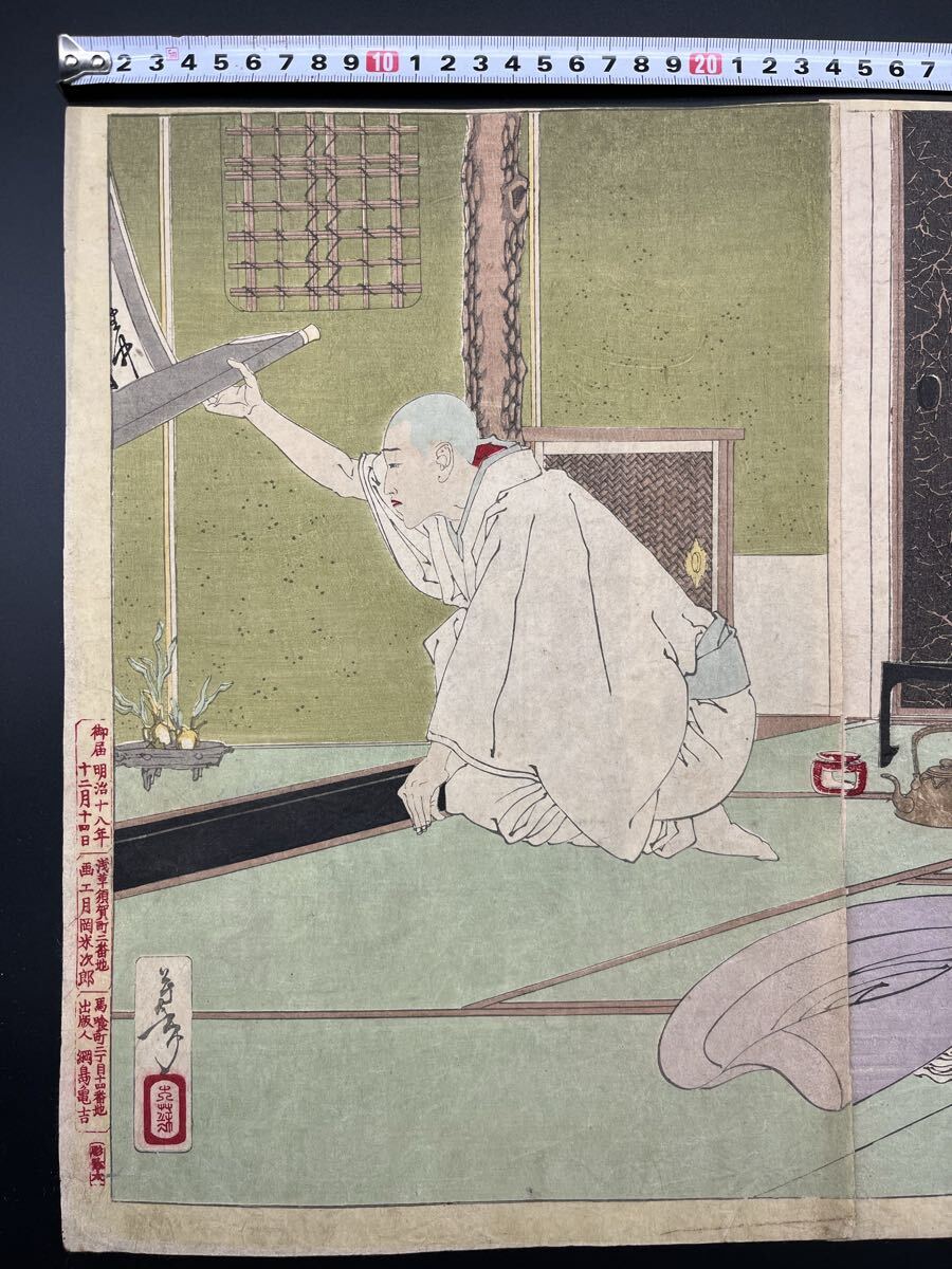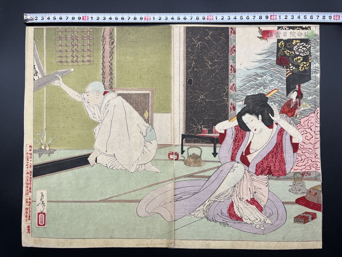 【真作】名作!本物浮世絵木版画 月岡芳年「延命院日当話」明治期 美人図 二枚続 錦絵 大判 保存良い
