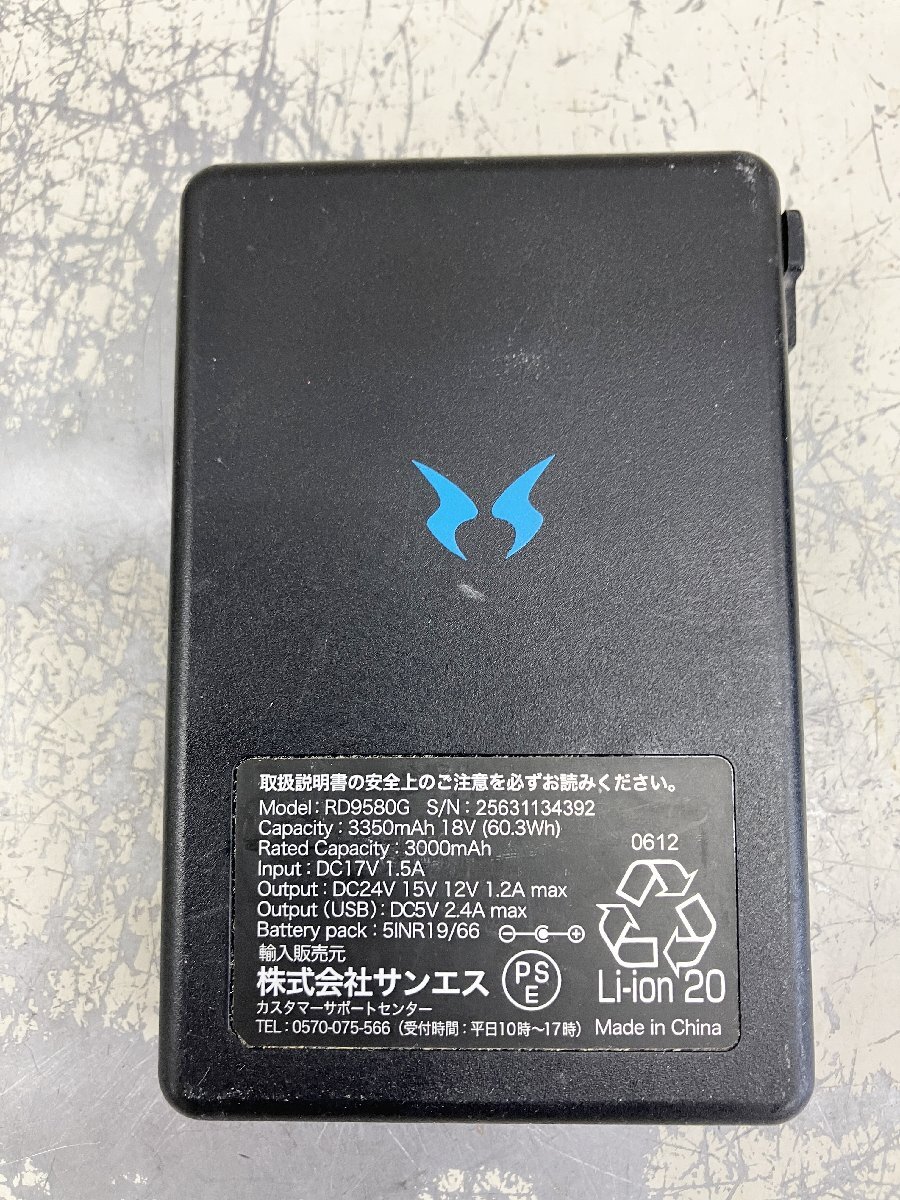 動作確認済みです。 サンエス 空調風神服 空調服バッテリー RD9580G ファンユニット RD9530 セット の中古出品となります。 少し傷や汚れがあり使用感があります。 写真が全てです。 ●当店出品商品におきまして、店舗での併売を行っているお品物がございます。 ご落札のタイミングによってはお品物のご用意が出来ない場合がございます。 店舗での販売が優先となりますので、あらかじめご了承ください。 ●簡易的な清掃はしておりますが、取り切れない汚れ・社名跡がある場合がございます。 ●リユース品ですので細かな傷・打痕・サビ・塗装剥がれ・変色等があります。 ●神経質な方・完璧なものをお求めの方は入札をお控えください。 ●弊社ではお値引き価格交渉等はご対応を行っておりません。 ●即決価格が設定されてい商品はオークション形式のみでの販売となります。 ●外国籍の方と以前のお取り引きでトラブルが発生した為、日本語が細かく理解出来ない方は入札をご遠慮下さい。 ●Please refrain from bidding if you are unable to understand Japanese in detail, as we had trouble with a previous transaction with a foreign national. | ||
