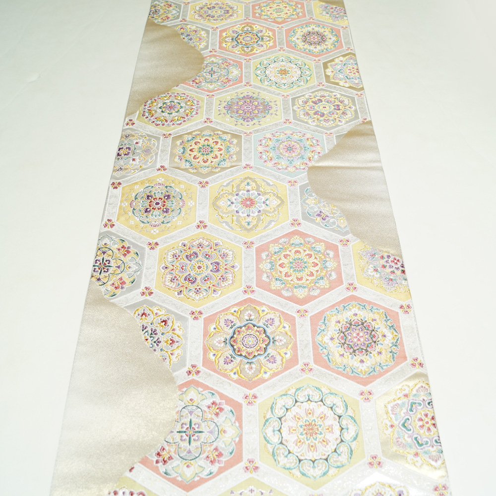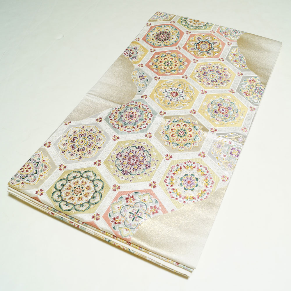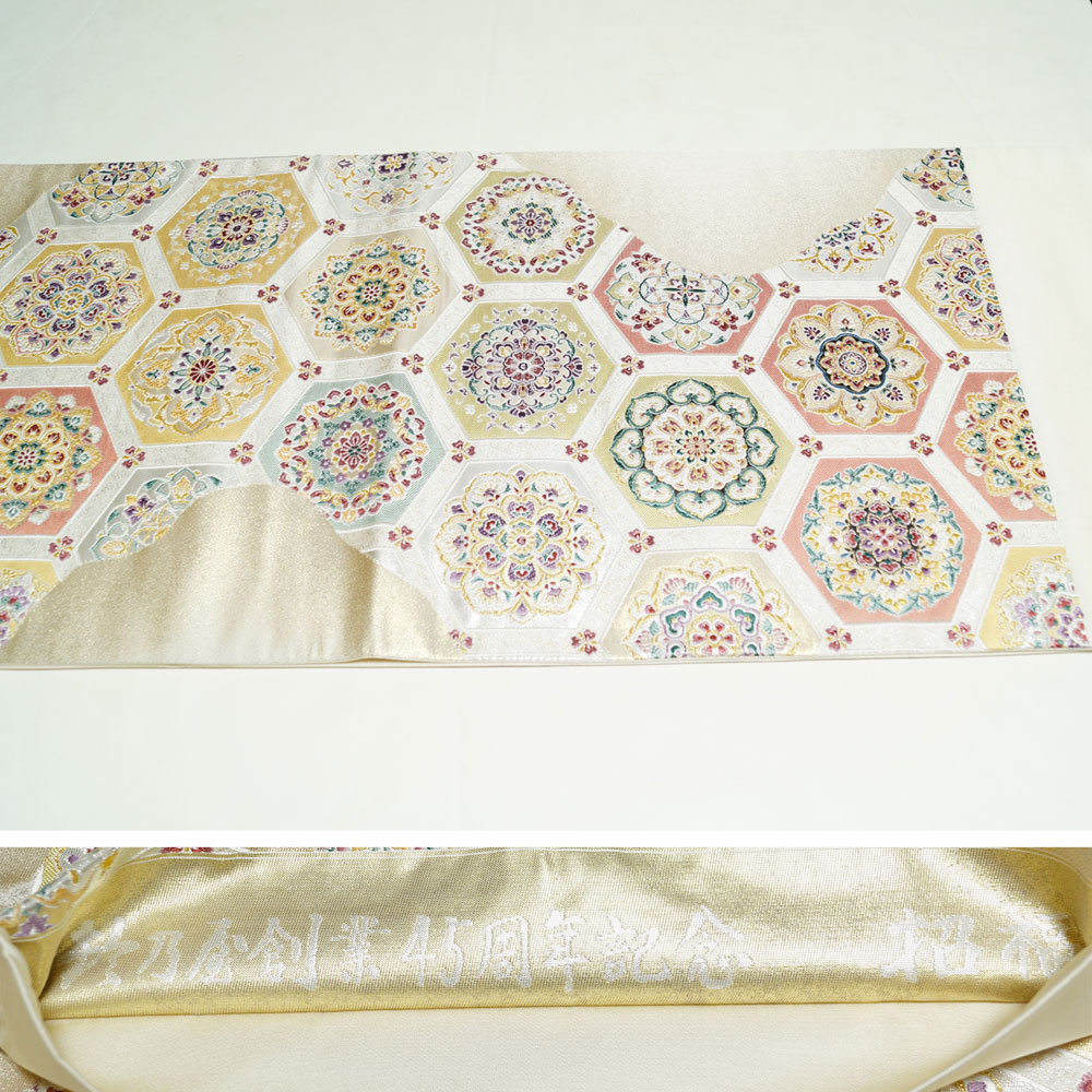 | 商品 説明 | 銀色系の地に金の霞、道長取に亀甲華文模様が織られた袋帯です。鈴乃屋扱い、垂れ先中に鈴乃屋創業45周年記念 招福とあります。 |