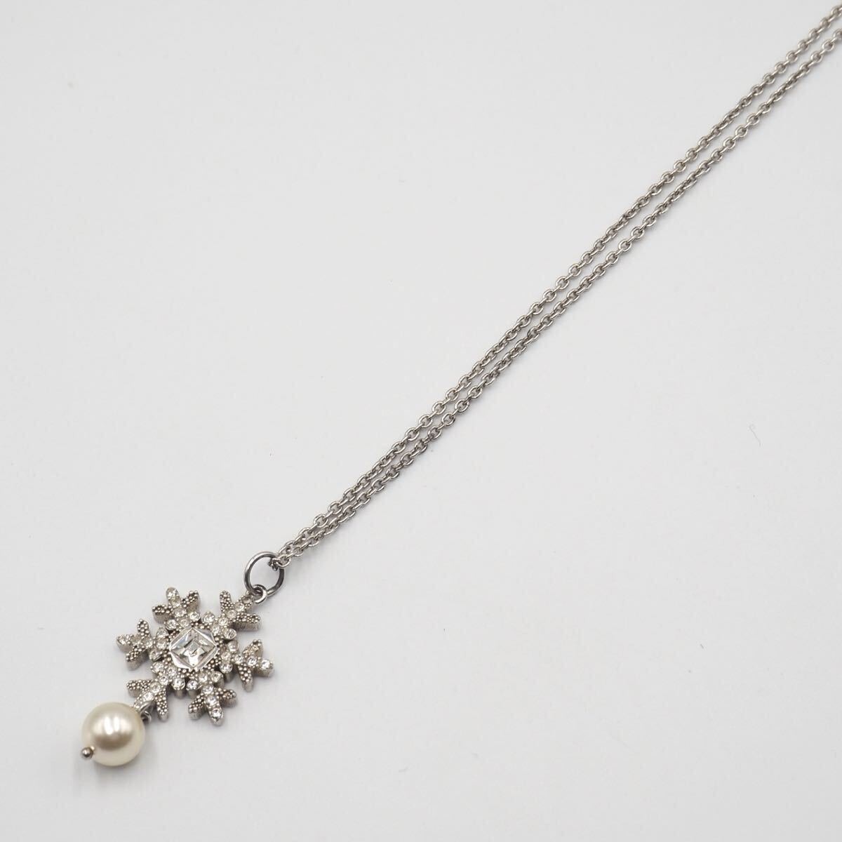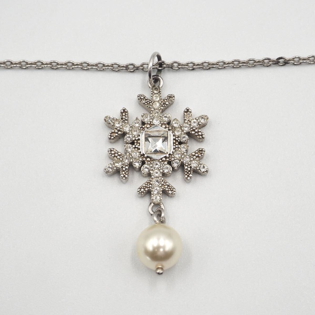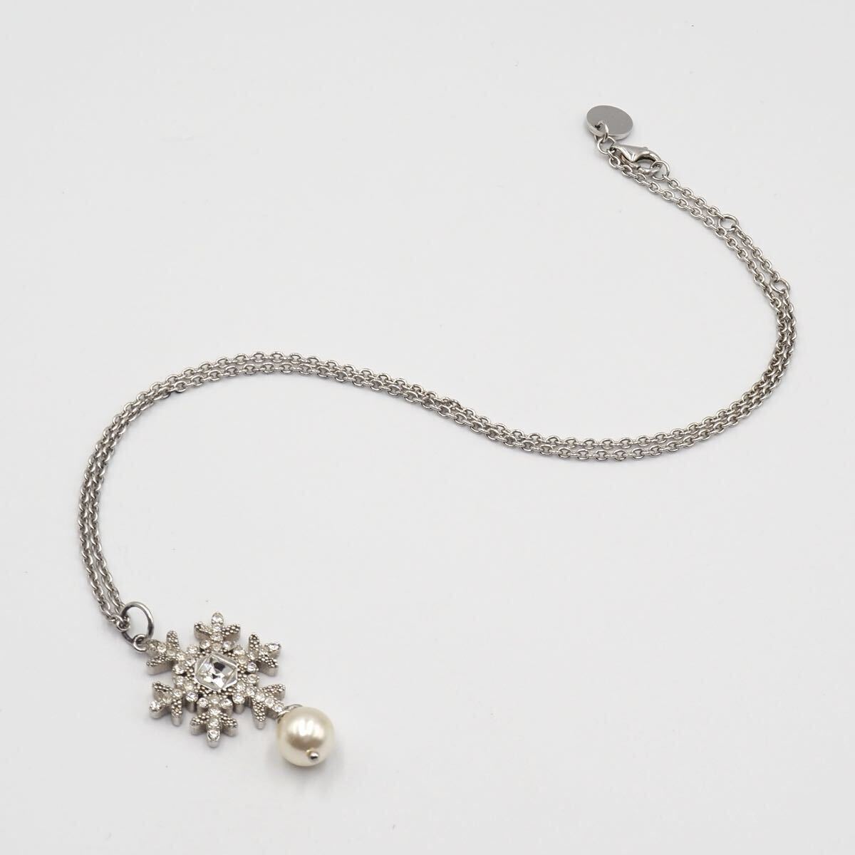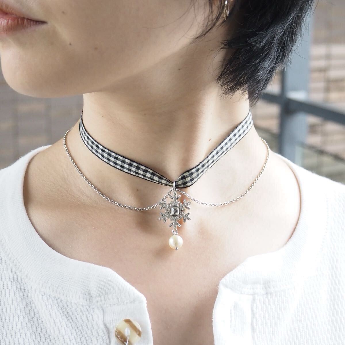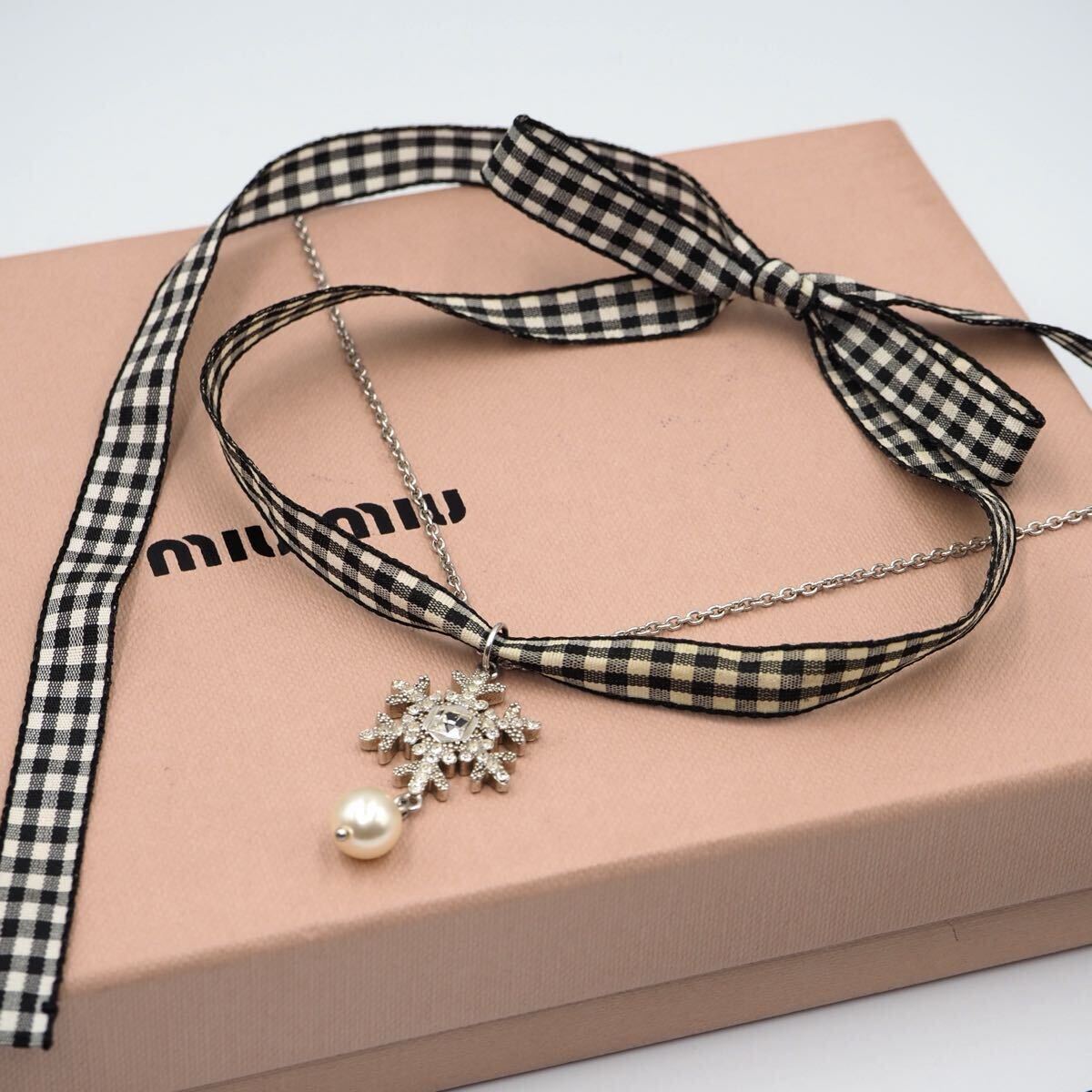 雪の結晶とギンガムチェックのリボンが可愛らしくも遊び心のある一点。様々な使い方で楽しめます。留め具部分のさりげないロゴも素敵です。