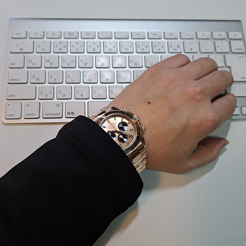 | コメント | ロレックス デイトナ 116505 PG無垢が入荷致しました。ゴールドの素材は塩素で褐色しやすい為、ロレックス独自の配合でプラチナが加えられ、永遠に輝きが色褪せない素材としてエバーローズゴールドが採用されています。こちらの商品は目立った傷等の無い綺麗な状態です。ギャランティに2021年に購入した記載があります。 ~出品担当の中村より~ エバーローズゴールドで統一された中にブラックのインダイヤルが良く映えてシックな雰囲気を醸し出してくれます。エバーローズゴールドは、イエローゴールドと比べると柔らかい印象があるので、アクセントになりつつも色んな洋服と合わせやすいお品です。 | ||