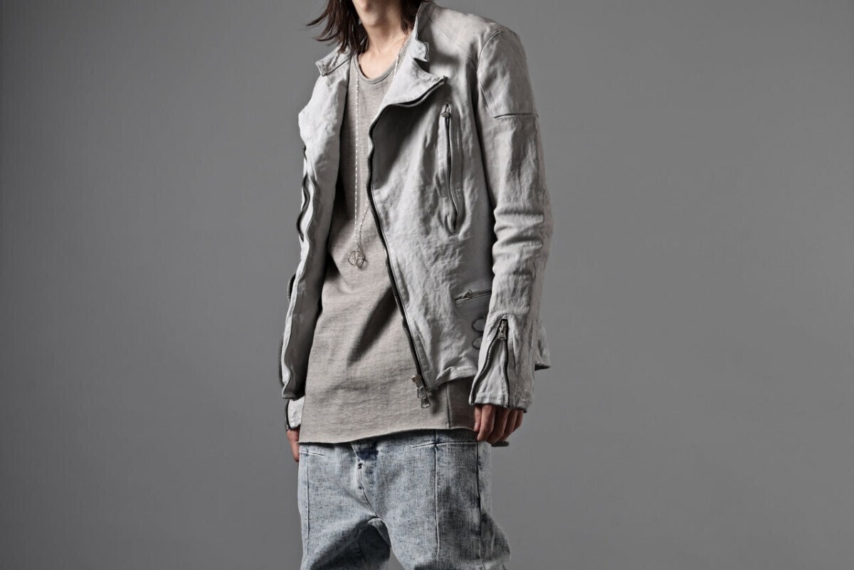 ベーシックなデザインのダブルライダースをブランドオリジナルパターンでソリッドに構築。胸部に垂直に、下方に水平2本ずつ計4本のファスナーポケットを配備、腰部の両サイドには前方に向かってダブルストラップのアジャスターを装着した英国らしさを感じさせるデザインを使用しています。高級レーヨンファブリックを裏地に採用することにより、非常に袖通しの良いライニング。ファスナーにはYKK社製高級タイプのEXCELLA(エクセラ)を採用、引手には実用性を考慮したブランドオリジナルデザイン。