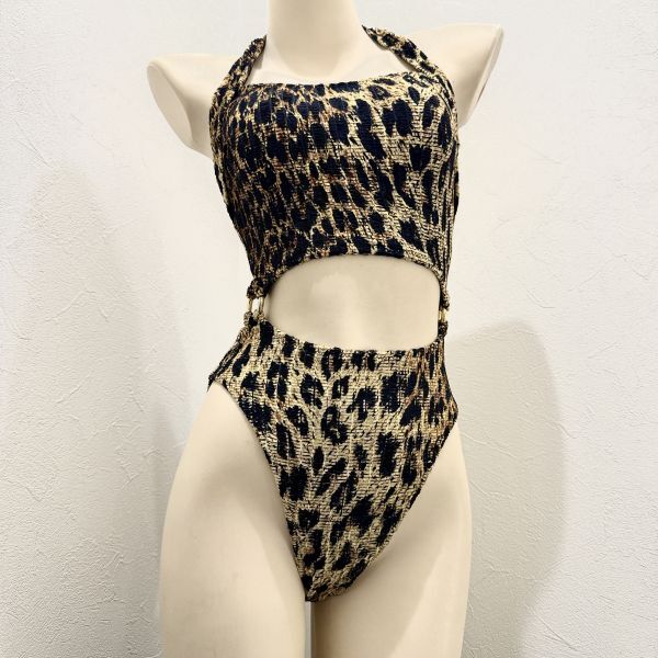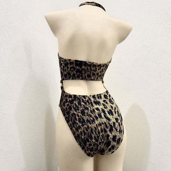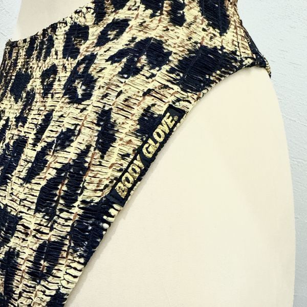 34 BODY GLOVE女子水着(M〜Lサイズ程度)★ホルターネック・ハイレグ茶色ブラウン豹柄レオパードおへそ出し★伸縮性あり男性も