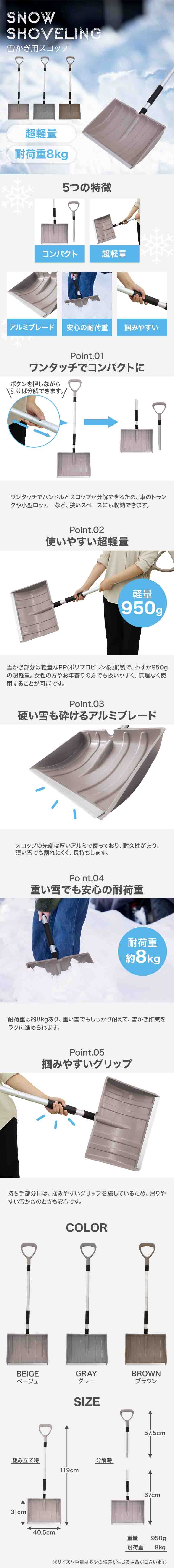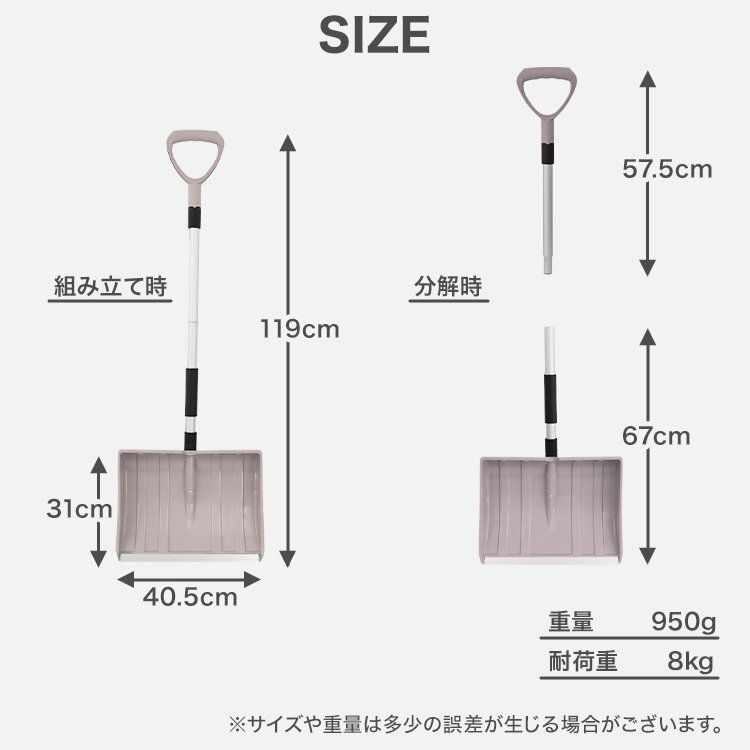 | 積雪を迅速かつ効率的に処理するスノーコップです。 ワンタッチでコンパクトに分解! ハンドルとスコップが分離できるため、車のトランクや小型ロッカー等、省スペースでも収納できちゃいます♪ 軽量な素材を採用し、わずか950gと使いやすさを追求しました! 女性の方やご高齢の方でも扱いやすく、無理なく作業ができます。 スコップの先端は厚いアルミで覆い、硬い雪も砕けやすいです。 また、優れた耐久性で長く使えます! 持ち手部分は掴みやすいグリップを施し、安心の耐荷重で雪かき作業もラクラクです! 【商品仕様】 カラー:ブラウン サイズ:(約)40.5cm×119cm(組立時) 重量:(約)950g 耐荷重:(約)8kg (雪かきスコップ 雪かき用スコップ 雪用スコップ 除雪スコップ ジョイントスコップ 雪かき機 プッシャー 雪かき用プッシャー 超軽量 折り畳み 折りたたみ 雪下ろし 雪落とし 雪対策 除雪作業 積雪 業務用 道具 グッズ おしゃれ かわいい 人気 おすすめ 安い) |