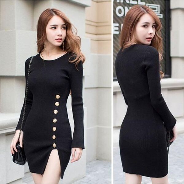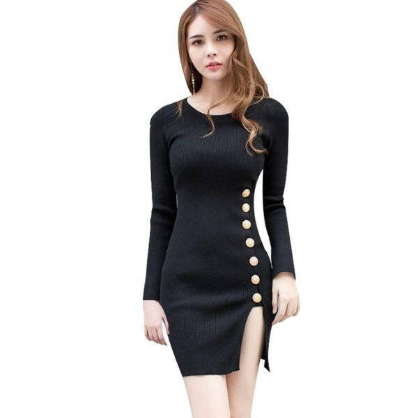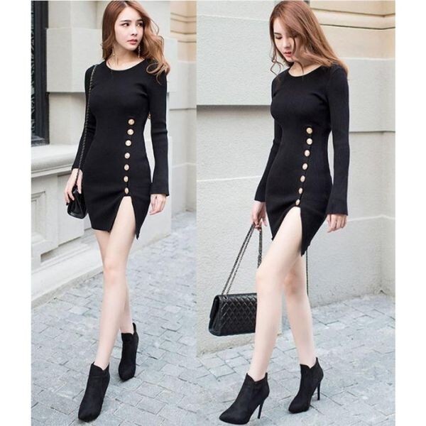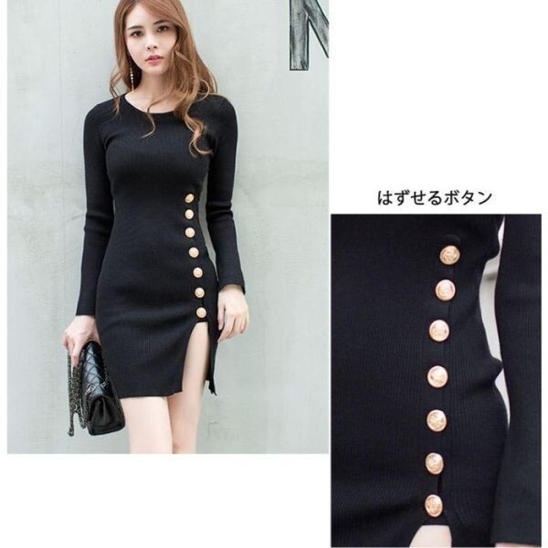 夜遊び パーティー ナイトワーク セクシー セクシー ミニドレス ワンピ 長袖 ブラックチュニック 飲み屋 スリット 着痩せ キャバ ボタン 黒