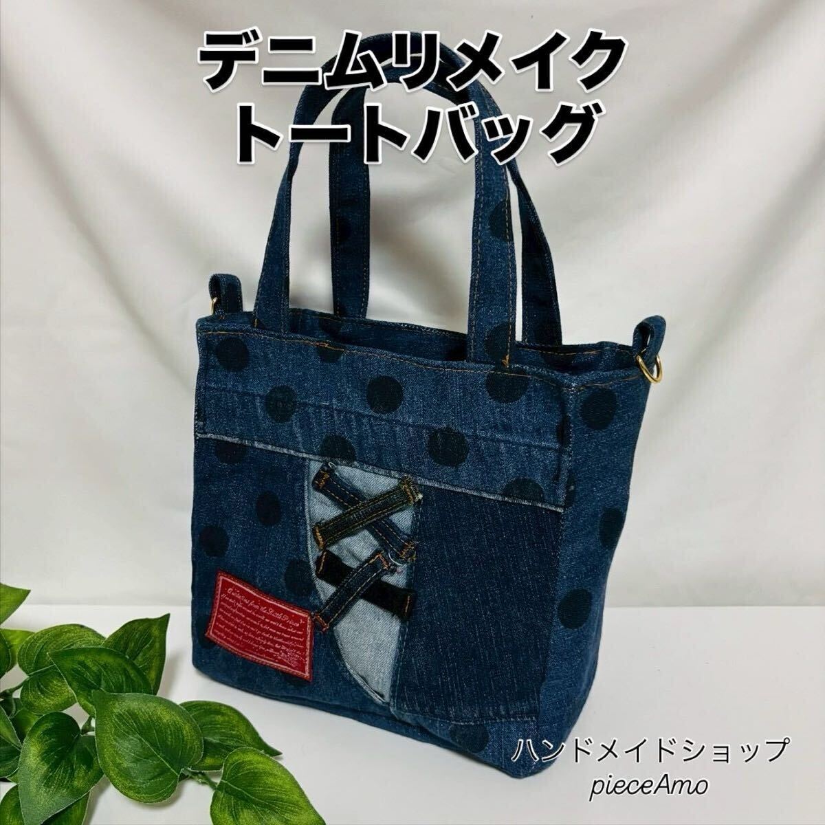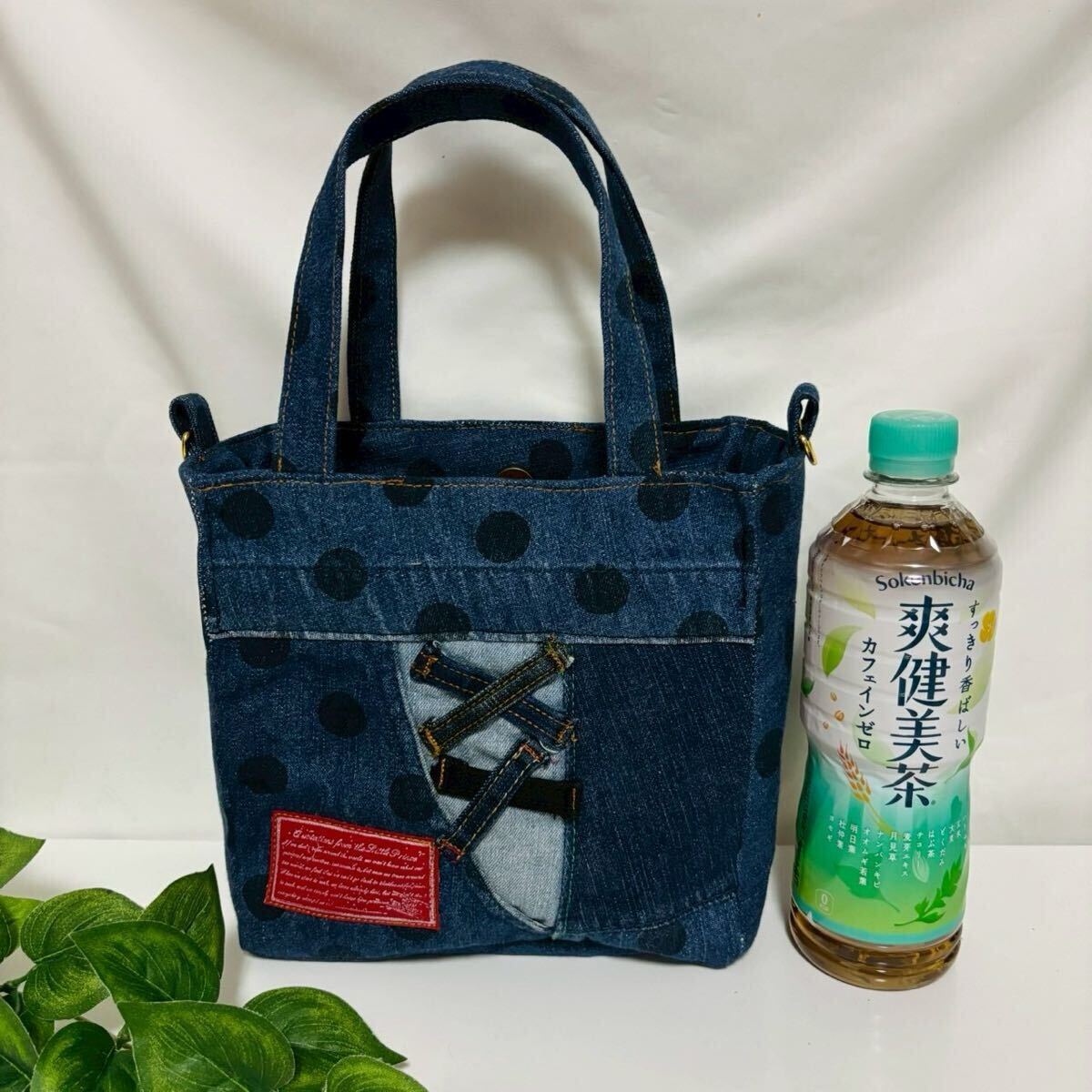 ■ドット柄のデニムをおしゃれにリメイクしたトートバッグです。