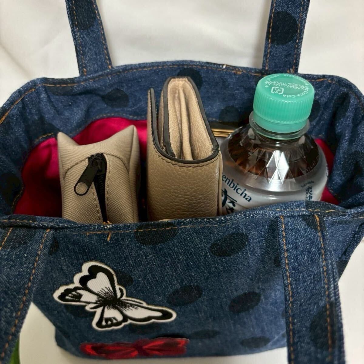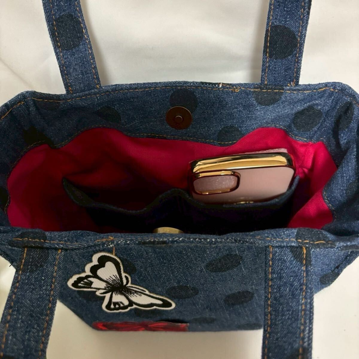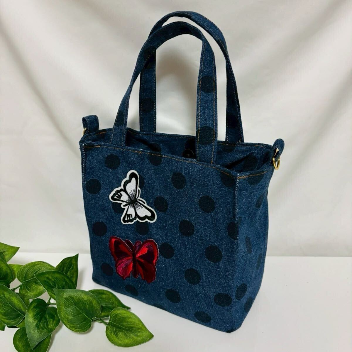 ■水玉模様のデニムトートバッグ、蝶ワッペン付き。