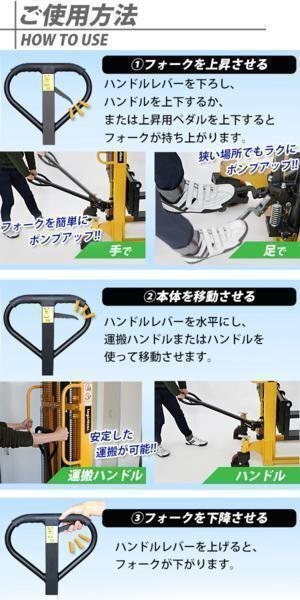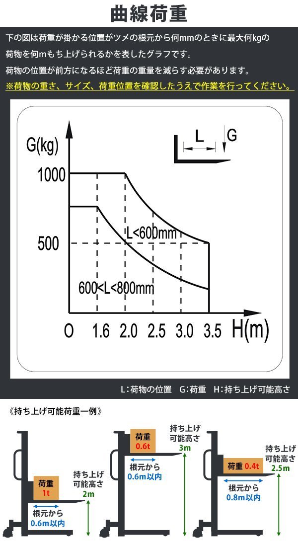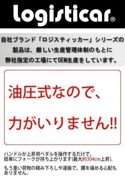 | 商品紹介 | ◆◆ハンドフォークリフト◆◆ ■重量物も楽々運搬のハンドフォークリフトです。 ■一部に亜鉛メッキを施しており、耐久性に優れています。 ■キャスターの材質は、PU(ポリウレタン)を使用。スムーズで耐久性にも優れており、音も比較的静かです。 ■主な仕様■ ●均等荷重(Capacity):約1,000kg ●本体重量:約322kg ●フォーク長さ: 約99cm ●フォーク最高位:約313cm ●フォーク最低位:約9cm ●車輪 前輪(φ)約7.5cm(PU)、 後輪(φ)約17.8cm(PU)ストッパー付 ■英語説明書付き。 ★ご購入前の注意事項★ ●こちらの商品は、完成品です。 ●こちらの商品は代金引換がご利用できません。ご注文時に代引き以外のお支払方法をお選び下さい。 ●こちらの商品 大型の商品の為、『西濃運輸の営業所留め』となります。あらかじめご了承下さい。 ※お届け先又は備考欄に必ず法人・事業所名をご記入ください!!! ●商品は大変重量がございますので、パレットに固定しての輸送となります。 荷受けには、フォークリフト等が必要になります。(お客様ご自身で、ご用意お願いします。) ●新品商品ではありますが、輸入商品の為、擦り傷、塗装はげ等があります。 ご納得の上、ご購入下さいませ。 ●ご購入後、お客様ご都合によるご返品、ご返金等は一切お受け致しておりません。 ●本商品を使用した際に発生したトラブル、事故につきまして、当社は一切の責任を負いません。 ご使用に関しましては、全て自己責任にてお願い致します。 |