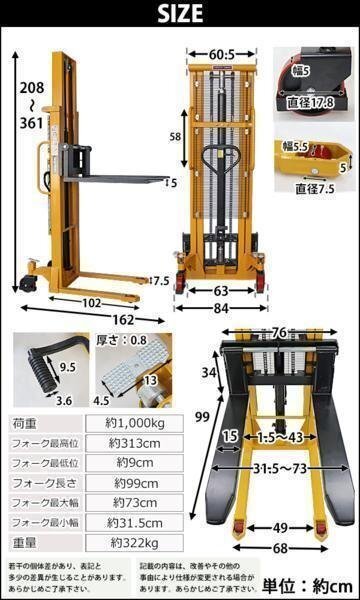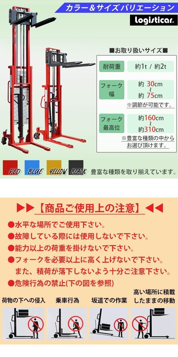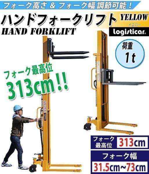 | 商品名 | 送料無料 新品 ハンドフォークリフト 昇降 最高位3130mm 1000kg フォーク長さ990mm 幅315~730mm 黄 伸縮 ハイアップ スタッカー フォーク ハンドリフト ハンドパレットトラック ハンドリフター ハイリフト イエロー 313cm 1t 99cm stacker1030yel |