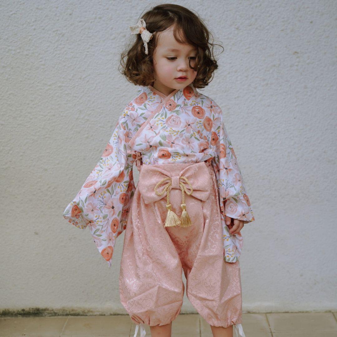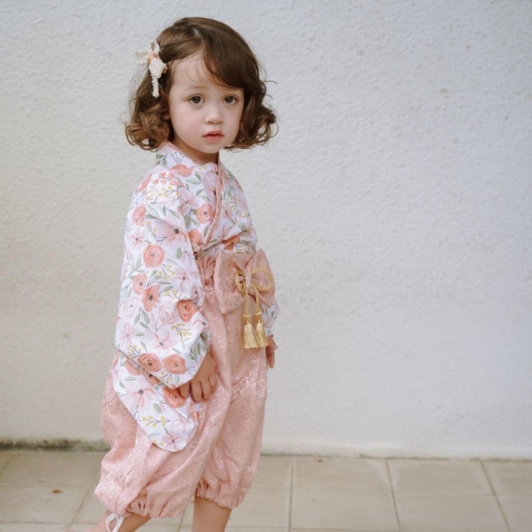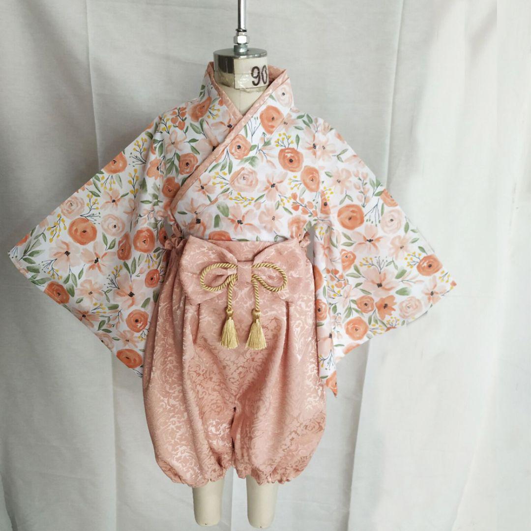 優しい色合いの花柄が可愛い、ベビー・キッズ用の袴ロンパースです。