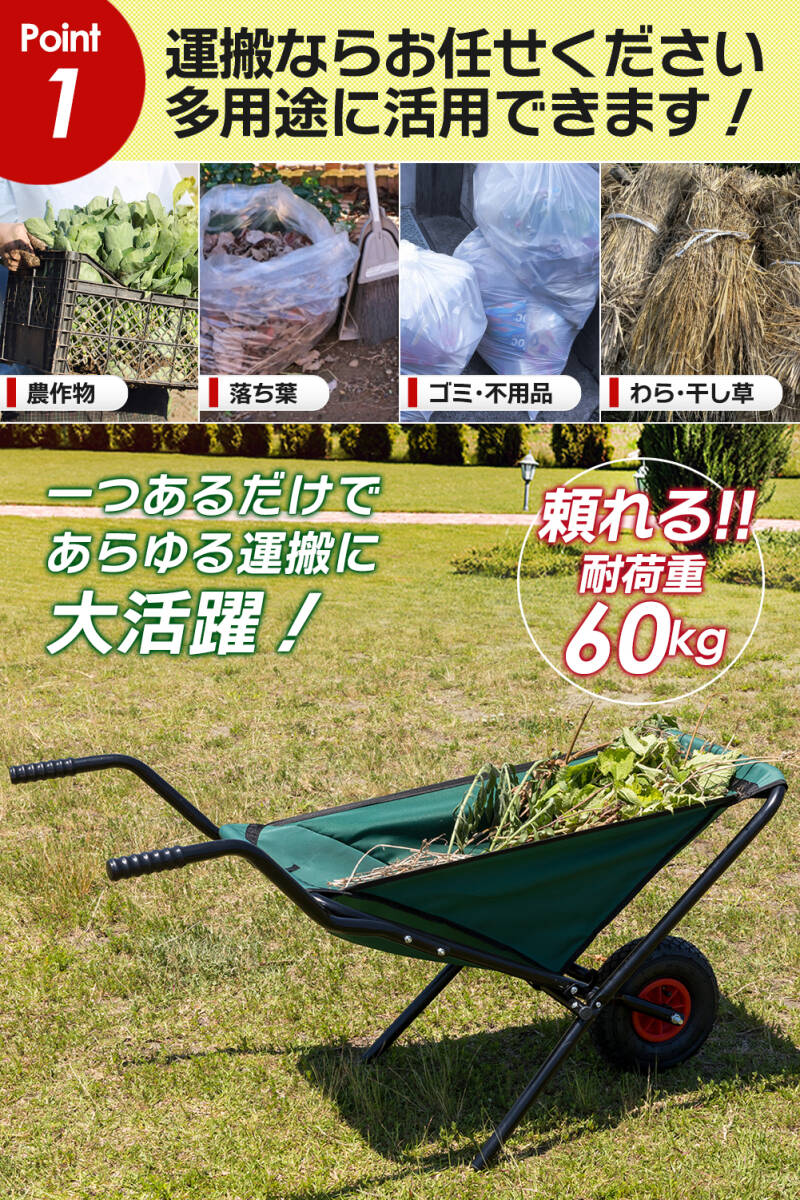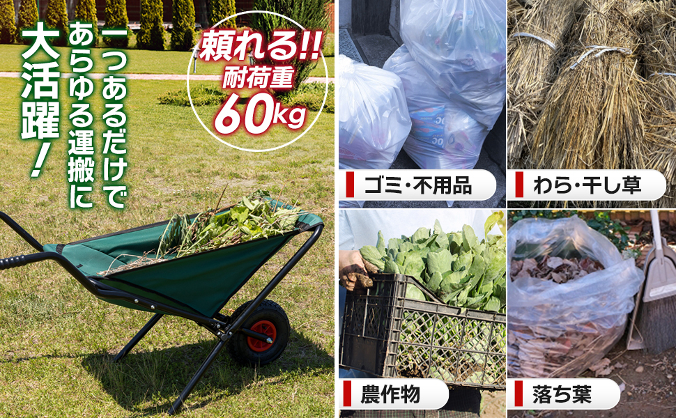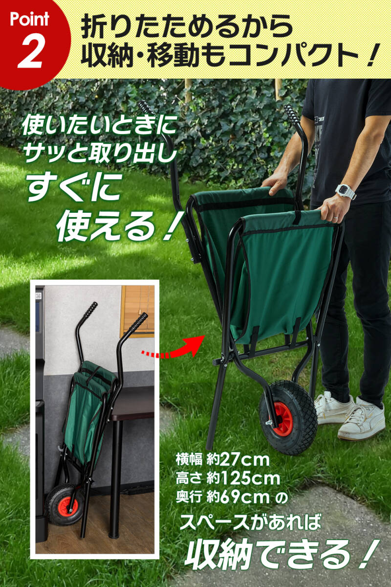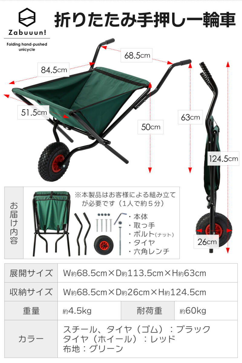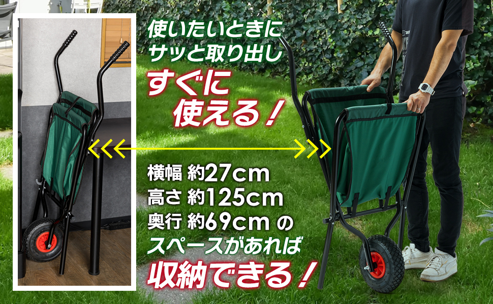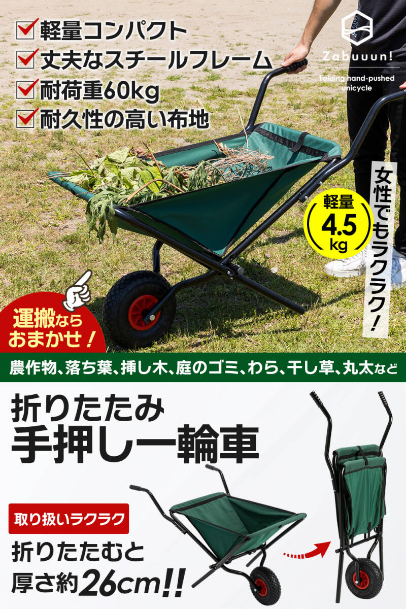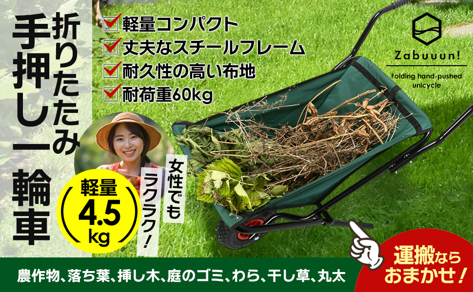 最軽量4.5kgのZabuuun!オリジナル折りたたみ一輪車です。折りたたみ式かつ軽量の為、女性でも簡単に操作可能です。折りたたんで収納時は約26cmとなり、省スペースでも収納可能です。園芸、農機具、農作物、落ち葉、挿し木、庭のゴミ、わら、干し草、丸太などを運ぶのに便利な一輪車となります。 |
