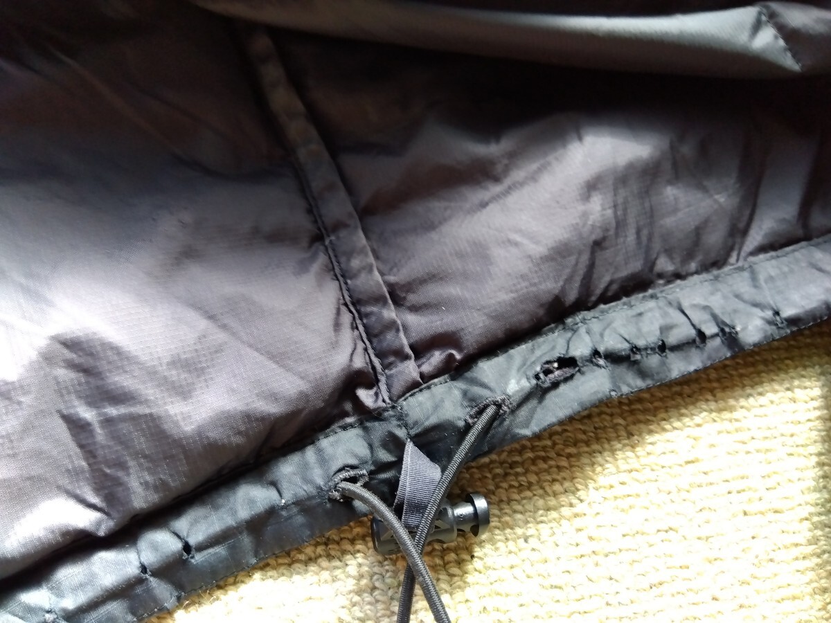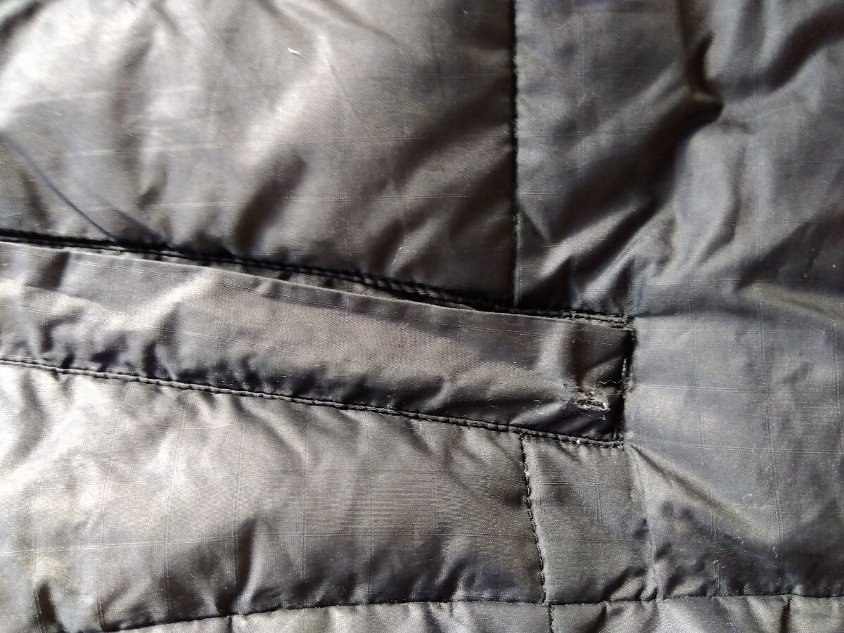 写真でご確認いただきたいのですが、よく見たら裾の部分の裏地がところどころ切れています。ヒモによって擦れたのかもしれません。ポケットのファスナー部分を隠す布も少し擦り切れています。