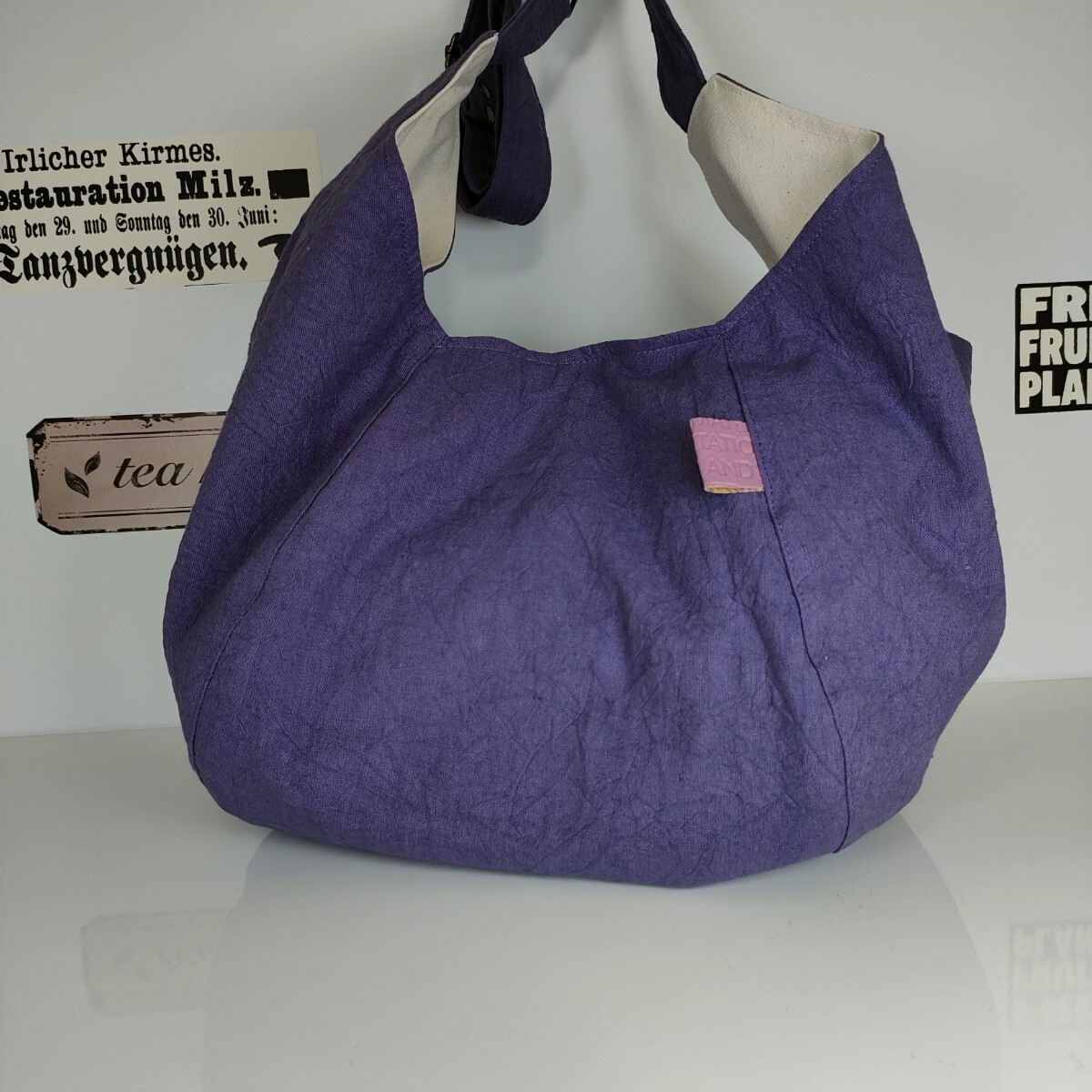 | 沢山の品の中から、ご覧いただきありがとうございます。 お店には売っていない、ハンドメイドの温かさをお届け出来ましたら幸いです。 ワッシャー加工されたコットンリネンキャンバス生地になります。シワ加工がされていて味のある雰囲気です。落ち着いた紫が素敵です。 ♪サイズ 深さ・・・バッグ真ん中位置で約28 横・・・ペタンと置いて入り口位置で47 肩紐・・・最長で102 ♪素材 表・・・コットンリネンキャンバス、カシメ、Dカン、送りカン、本革のタグ 内側・・・11号帆布、カシメ、 画像に写っている状態は、肩紐75センチの長さで斜め掛けにしています。 肩紐に送りカンをつけましたので、ショルダーや斜め掛けにもなります。 内側は、しっかりとした11号帆布で。ペットボトルも入る深さの2部屋のポケットを、両側に付けました。 毎日の小物や、バッグを製作しています。 どうぞよろしくお願いいたします。 ★リネン、コットンは天然素材ならではのネップ、スラブ等ございます。 ★雨、汗、摩擦などで、色落ちする場合がございます。 ★生地の色、厚さに合わせなるべく糸を変えアイロンをこまめに掛けながら、職業用ミシンで丁寧に製作しています。 | |||