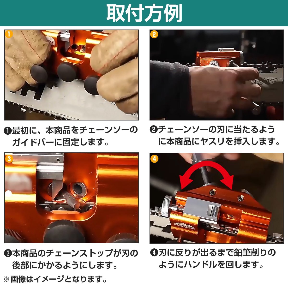 商 品 説 明チェーンソーにセットするだけで簡単に目立てができる、チェーンソー目立て機です。