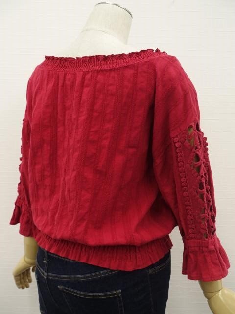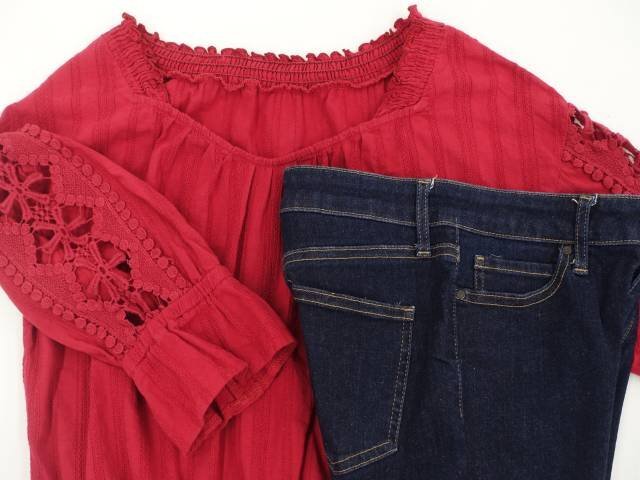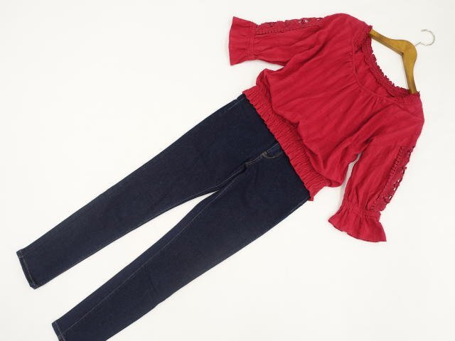 洗える七分袖ブラウス+デニムスキニーパンツ コーディネート上下2点セット M相当 レッド/ネイビー カジュアル系 20代~