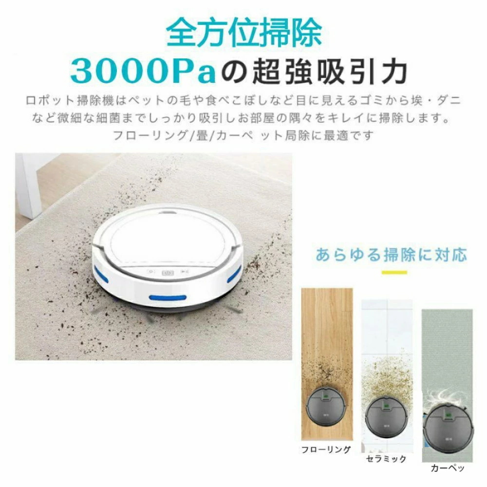 ロボット掃除機は、パワフルな吸引力と長時間の稼働時間によって、掃除効率を高めます。最大3000Paの吸引力で、細かなホコリやゴミ、ペットの毛などをしっかりと吸い取ります。さらに、最長90分間の連続稼働時間は、一度の充電で多くの部屋を掃除することができます。3000pa強力な吸引力で、髪の毛やペットの毛をしっかりと吸い込めます。ロボット掃除機はブラシレス吸引口設計です。ブラシレス吸引口なので絡みともつれを防ぎ、清掃の手間が省ける。3000Paの強力なブラシレスモーターを搭載し、他社の従来品より、1.6倍以上の吸引力を持ちます。畳、フローリング、カーペットの奥から、ゴミ、毛、微細なホコリまでしっかり吸い込み、特にペットの毛に効果的です。更に、静音、標準、強力という3段階の吸引力があり、色々なシーンに適応しています。
