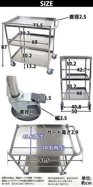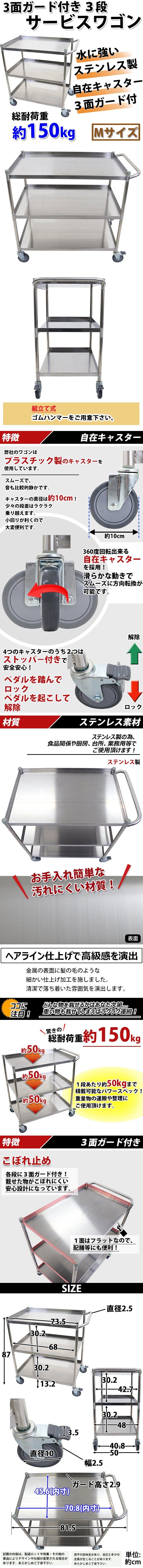 | 商品名 | 送料無料 ワゴン ステンレス サービスワゴン ガード付き 3段 Mサイズ 総耐荷重約150kg ステンレスワゴン キッチンワゴン キャスター ストッパー サービスカート こぼれ止め ステンレス製 回診車 配膳カート 配膳ワゴン 配膳車 リブ レストラン 業務用 厨房 daishaxb828m |