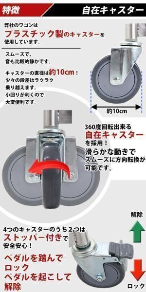| 商品紹介 | ◆3面ガード付き ステンレスサービスワゴン3段◆ ●あらゆる厨房で小回りのきく多目的なステンレス製サービスワゴンです。 ●各段には3面ガード付きで、こぼれにくい設計になっています。 ●1面はフラットになっているので、配膳等にも便利です。 ●自在キャスター付きなので、移動もラクラク!滑らかな動きで方向転換が可能です。 ●後方のキャスターはストッパー付きです。 ●サービスワゴンの表面仕上げはヘアライン仕上げです。 ●重量物の運搬や整理にもご使用頂けます。 ※こちらの商品は、組立て式です。 (ゴムハンマーが必要です。お客様でご用意下さい。) ■棚板寸法(内寸)…W約45.6×D約70.8(cm) ■棚間隔…H約30.2(cm) ■重量:約14kg ■材質:ステンレスSUS430(本体棚)、ステンレスSUS201(本体パイプ)、プラスチック(キャスター)、スチール(キャスター金具) ■耐荷重:約50kg /(棚板1枚) 約150kg /(全体) ●英語説明書付き ★ご購入前の注意事項★ ★1階車上でのお渡しとなります。荷降ろし・搬入は、お客様にてお願いいたします。 ●新品商品ではありますが、輸入商品の為、多少の擦り傷などがある場合がございますので、 ご納得の上ご購入下さいませ。 ●ご購入後、お客様ご都合によるご返品、ご返金等は一切お受け致しておりません。 ●本商品を使用した際に発生したトラブル、事故につきまして、当社は一切の責任を負いません。 ご使用に関しましては、全て自己責任にてお願い致します。 |