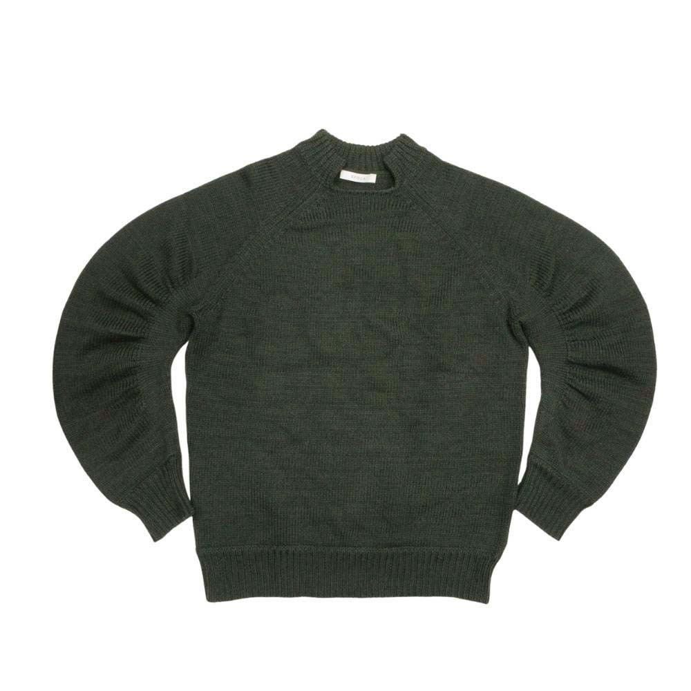 やや厚みのある編み地を使用し、落ち着いたカーキカラーが秋冬の装いにマッチします。