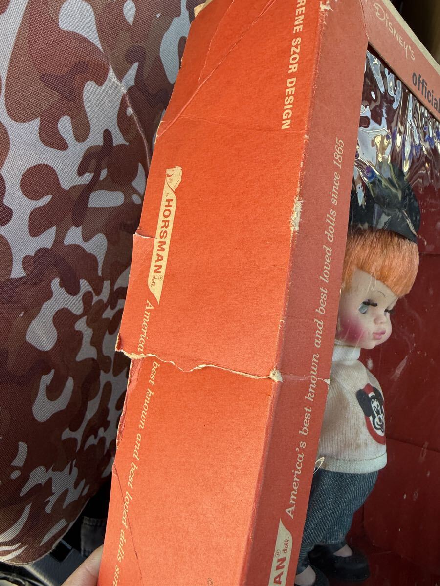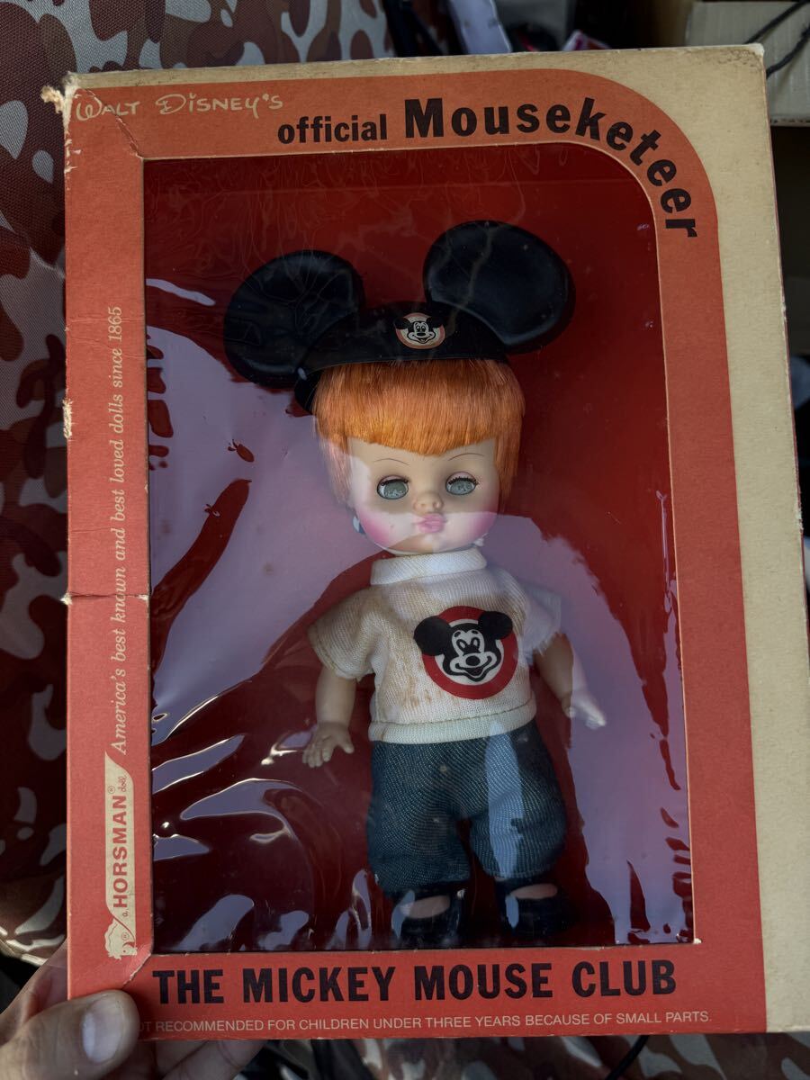 1960年代、Horsman社がWalt Disney公式ライセンスのもと製造した「Mouseketeer Doll」のオリジナル個体です。ミッキーマウスクラブの公式キャラクタードールとして知られ、当時アメリカの百貨店やDisneyland園内で実際に販売されていた資料性の高い正規品となります。今回の個体は箱と帽子が揃う貴重なセットで、現存数が極めて少ない上位ランクのヴィンテージとしてコレクター需要が非常に高いものです。