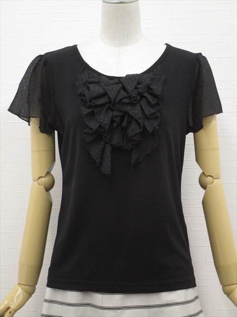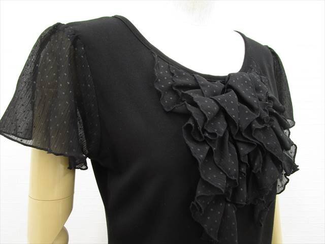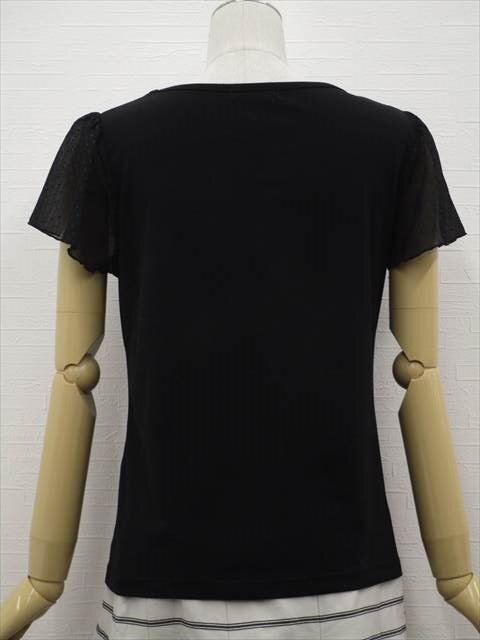 フレアスリーブ 半袖 ラウンドネック カットソー L ブラック&ブラック地 グレー ドット柄