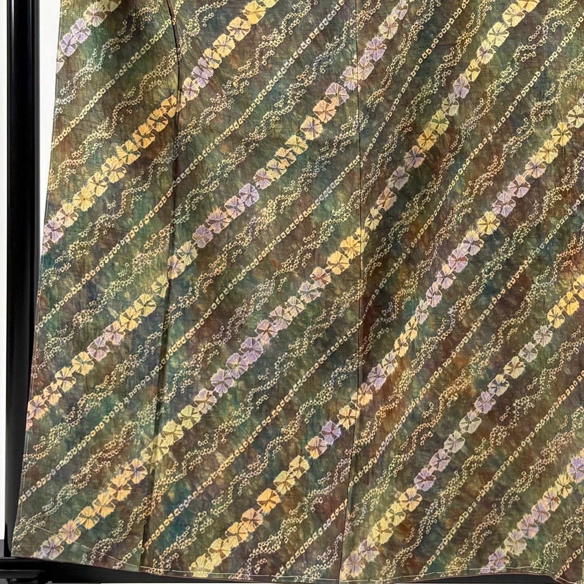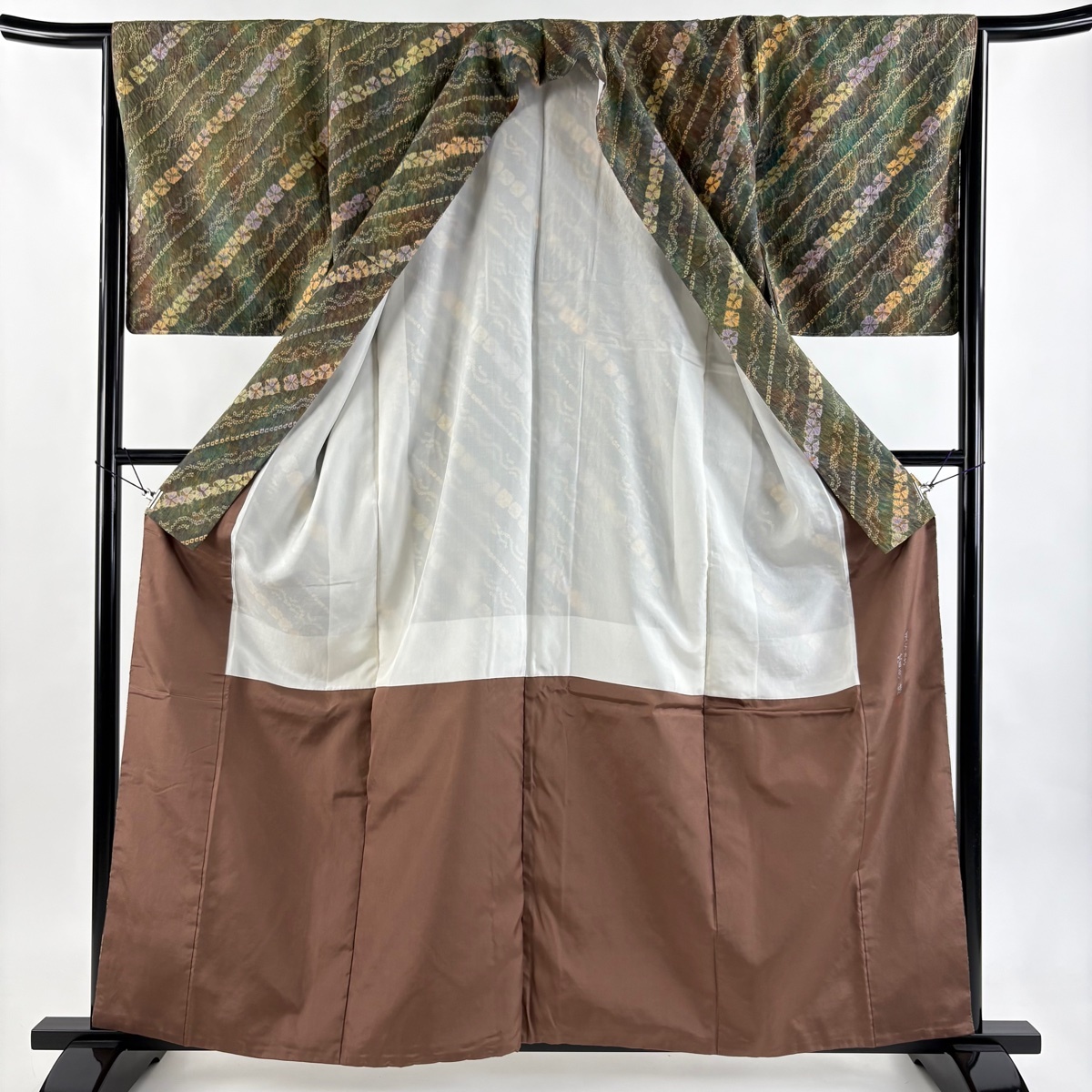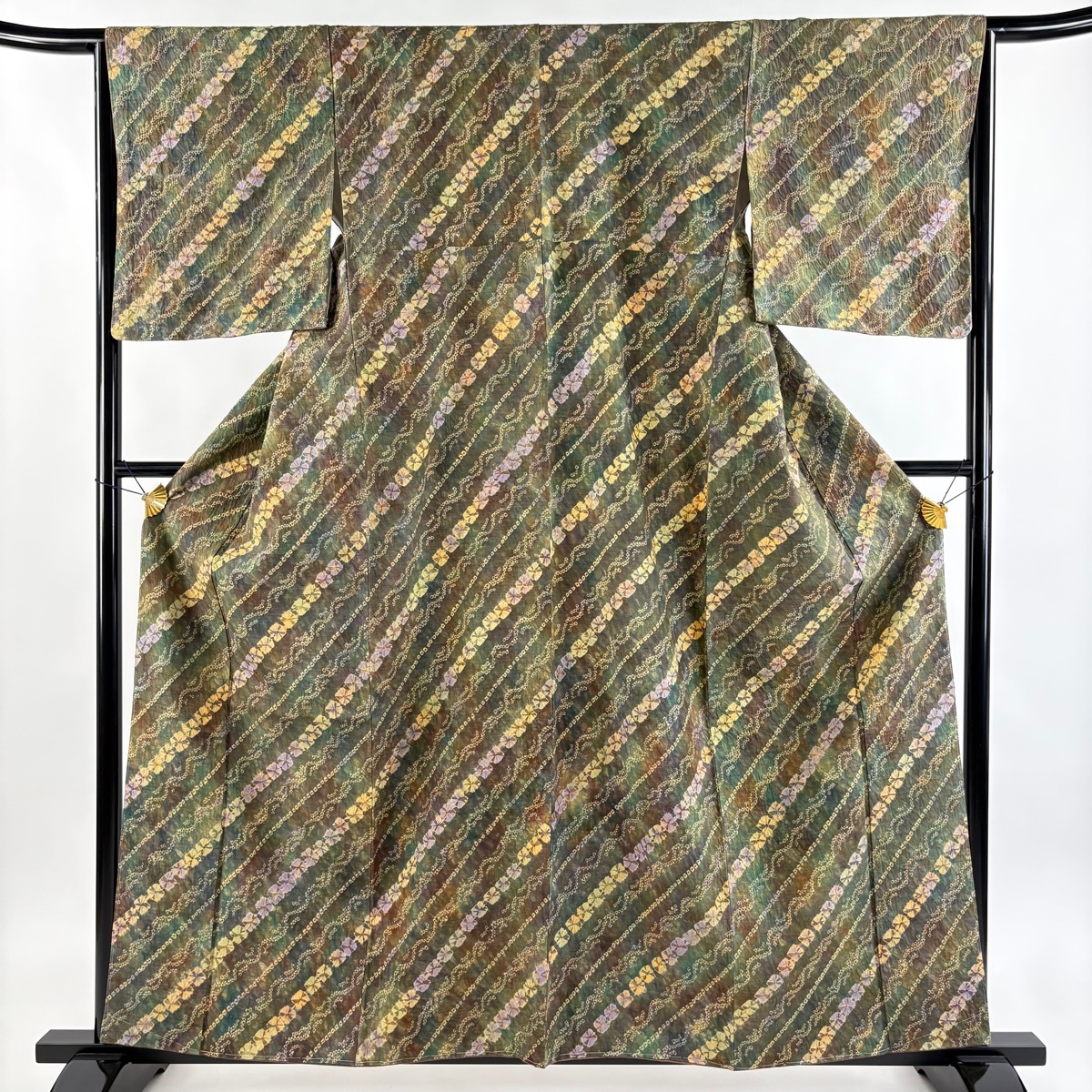 | 小紋 美品 逸品 菅原結 落款 漢方染紬 やまと 幾何学 斜縞 絞り 茶緑色 袷 身丈159.5 裄丈65 M 正絹 【中古】 |