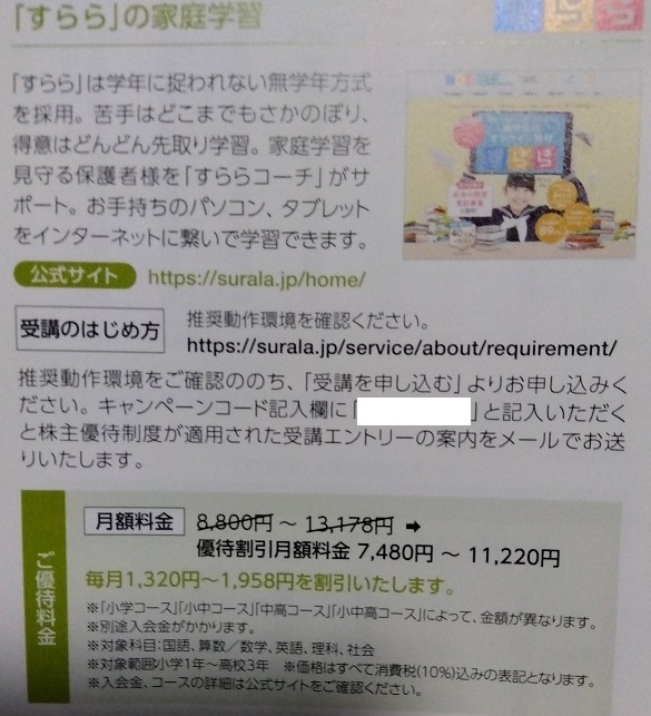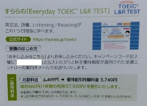 | すららネット 株主優待券 受講割引クーポン すらら家庭学習 Everyday TOEIC L&R TEST ほめビリティ ペアレンティング | |