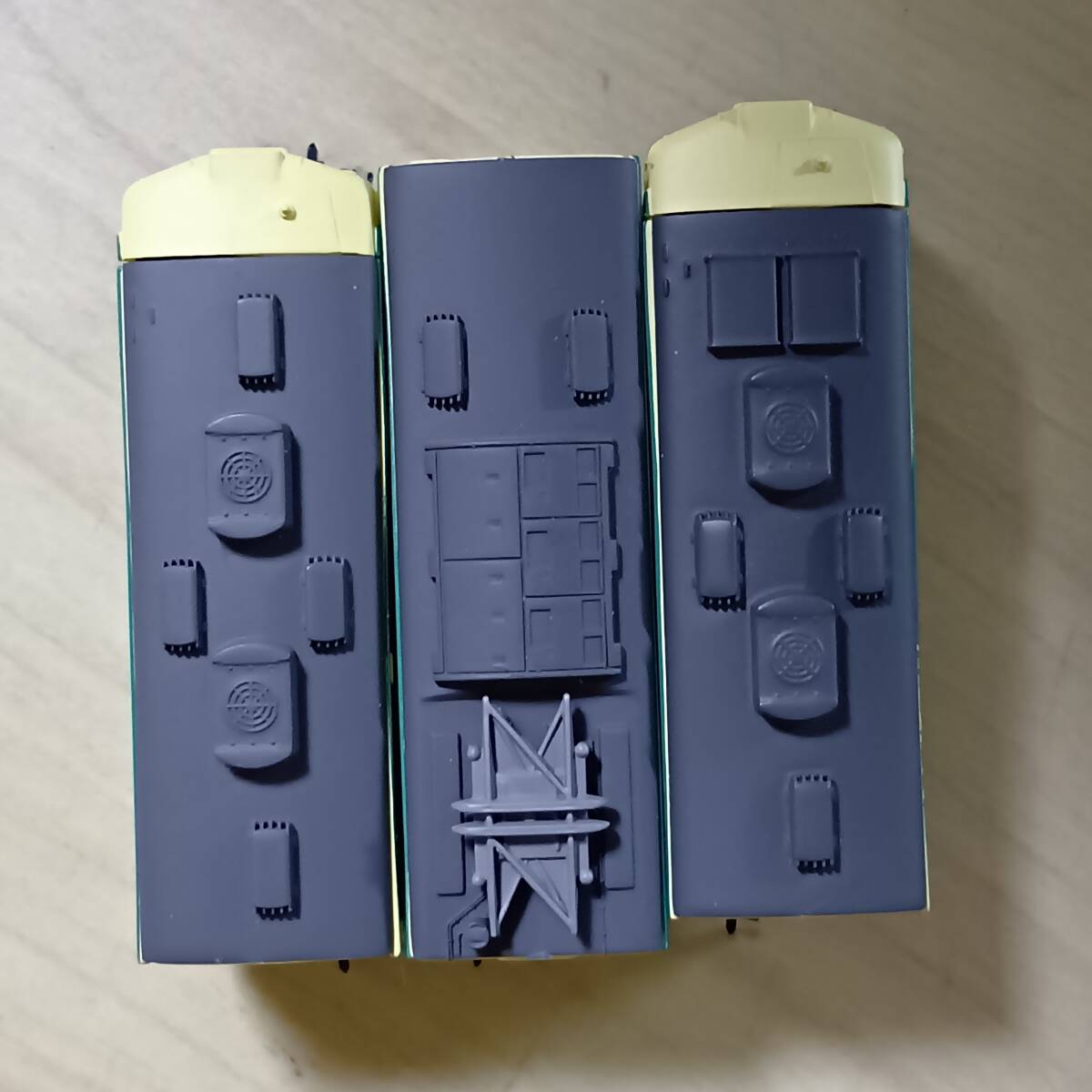 写真のもの送ります。きれいなものもあれば、塗装はげ、色付き、傷、欠品、壊れている(ボディー割れ、スカート割れ他)ものもあります。組間違いや他車部品(妻、レリーフ、パンタグラフ、スカート他)が使われている場合もあります。それらが、ついていない車両もあります。