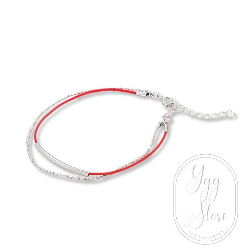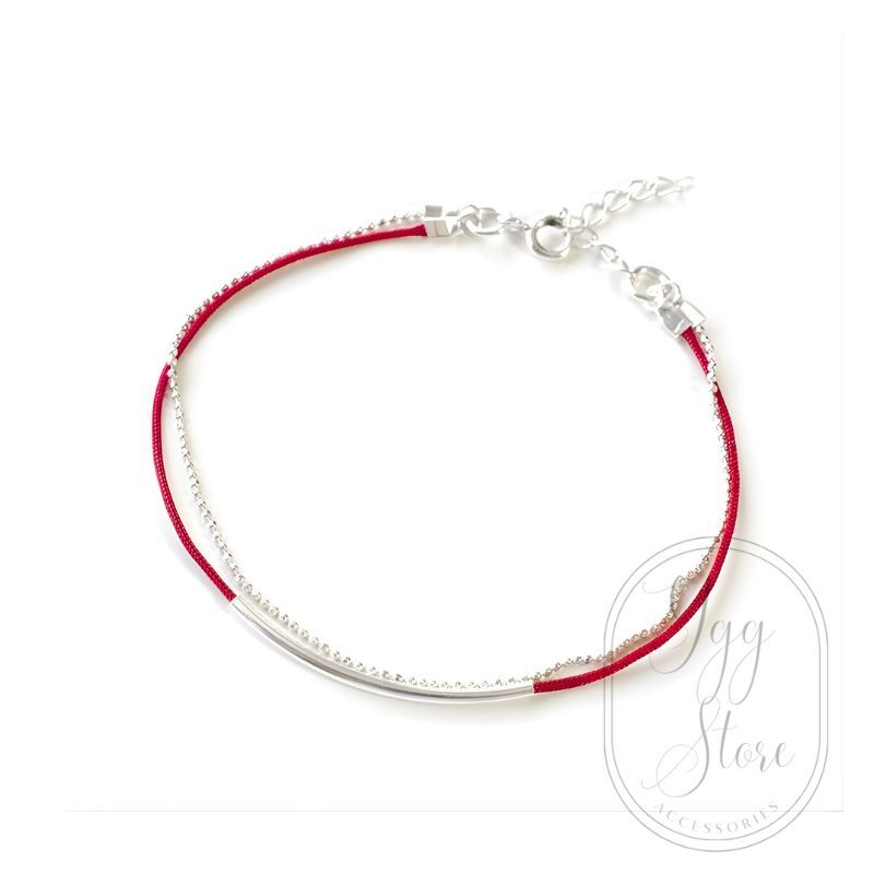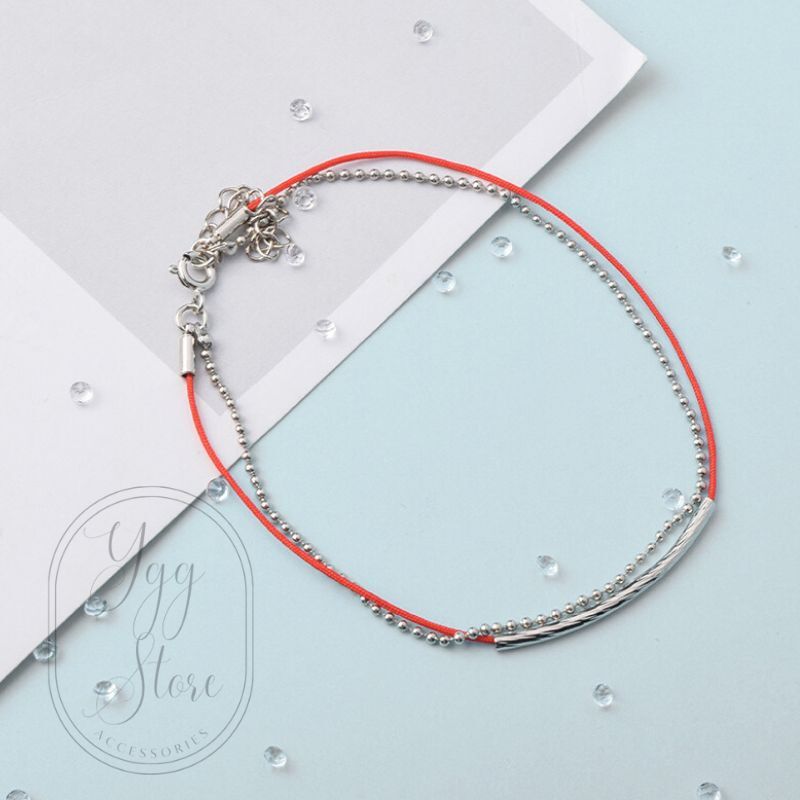 商品名:YGG■ボールチェーン付き 紐ブレスレット ミサンガ 2重 ダブル 赤xシルバー レッド 華奢 男女兼用 韓国アクセ BTS V