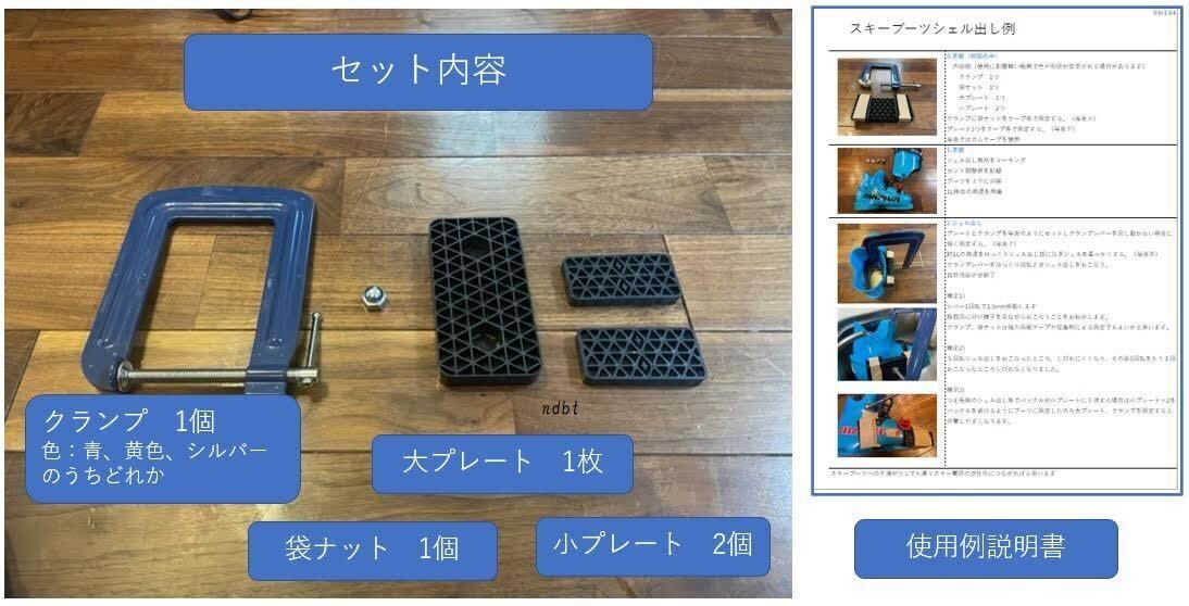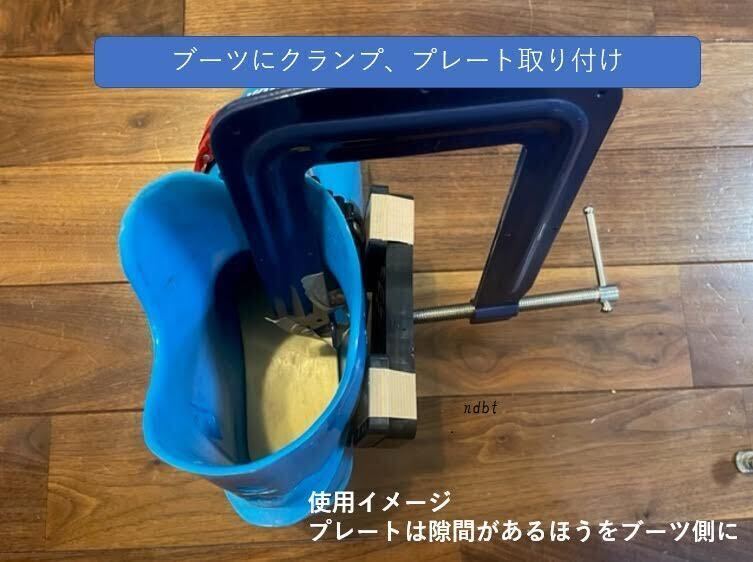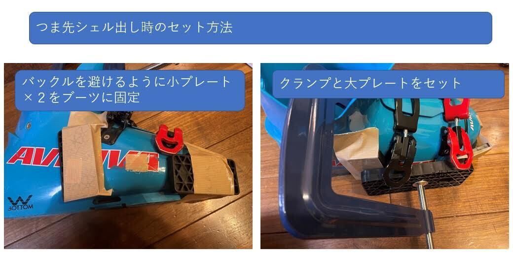 スキーブーツに取り付け、熱湯でシェルを温め柔らかくした後、クランプによってシェル出しをおこなえるセットです