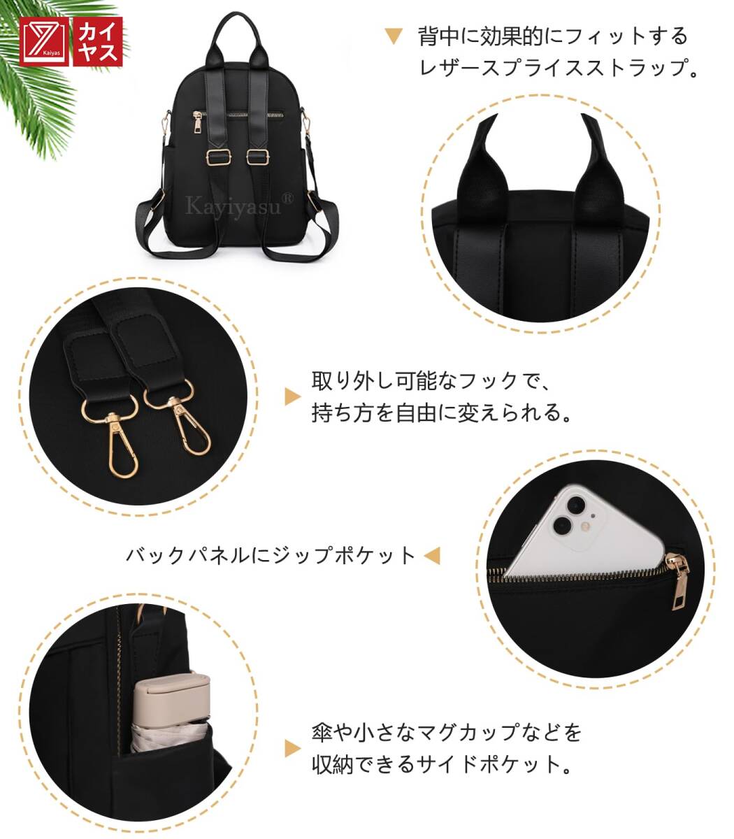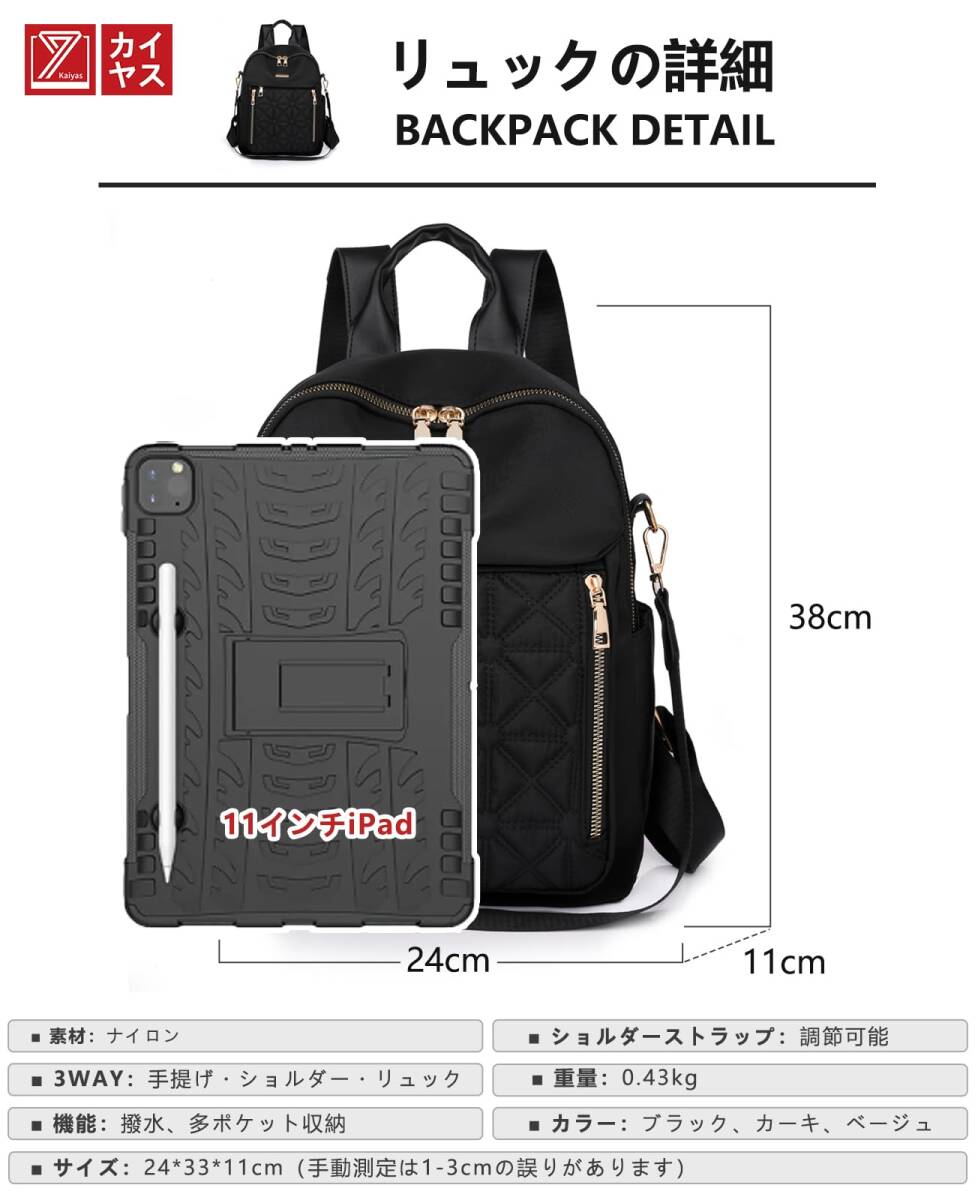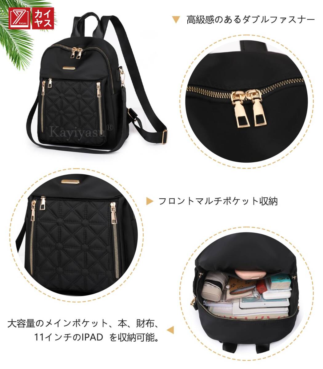 多収納ポケット:バックパックサイズ:幅24高さ33厚さ11cm、バックパックには複数のポケットデザインがあり、フロント部分には三つの小さなファスナーポケットがあり、口紅、バスカード、鍵など小物を収納できます。 大容量メインルームは11インチipad、雑誌、水筒、財布、ミニポーチなど内部に、小さなファスナーポケットと小さな口を入れることができます。 サイドポケット、小さな傘とコップが収納できます;後ろファスナー付きの小さなポケット、携帯電話、クレジットカード等の重要な物を入れることができます。 お出かけにはこれ1つで十分です。