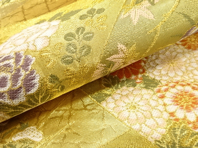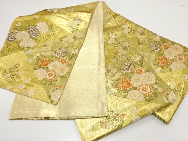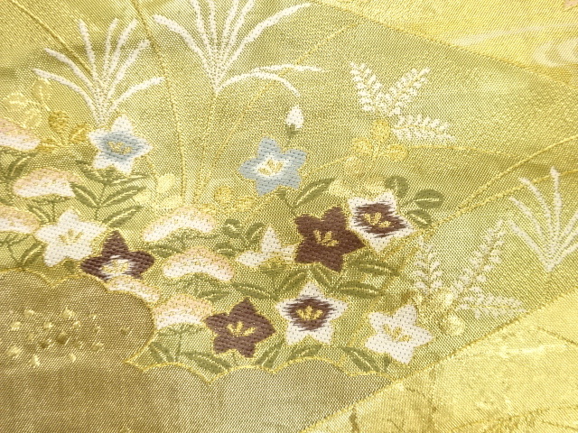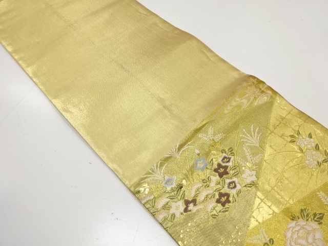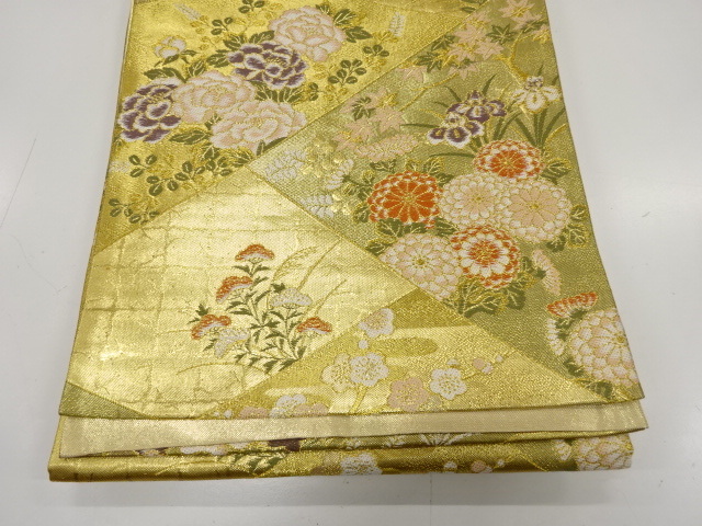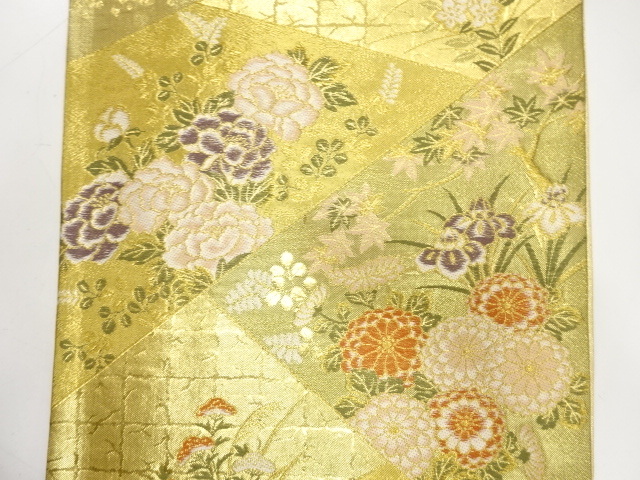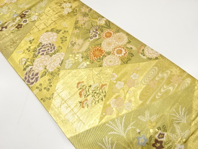 美品 切りばめ風 四季草花模様織り出し 袋帯 (AAAA3K-015)