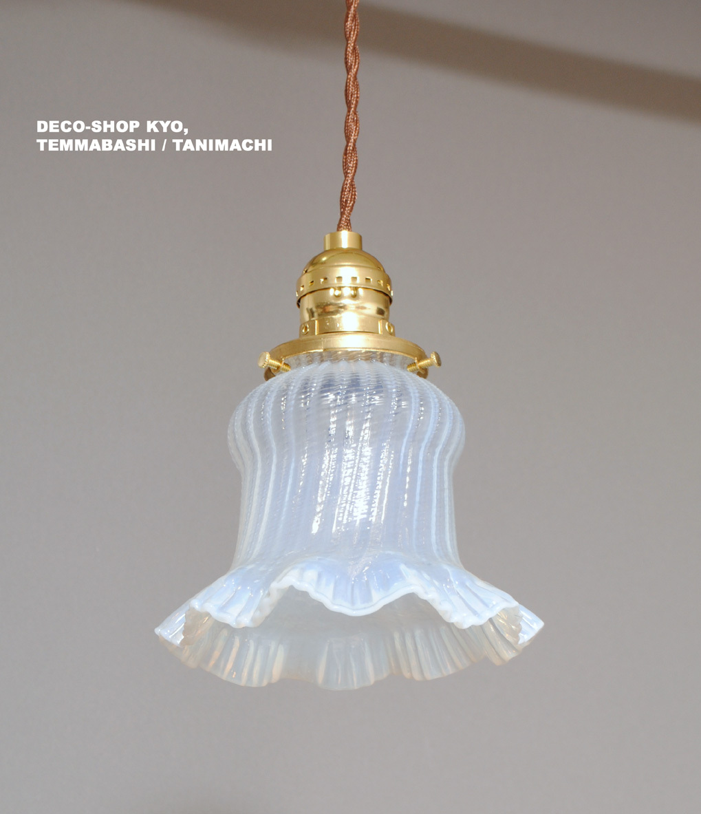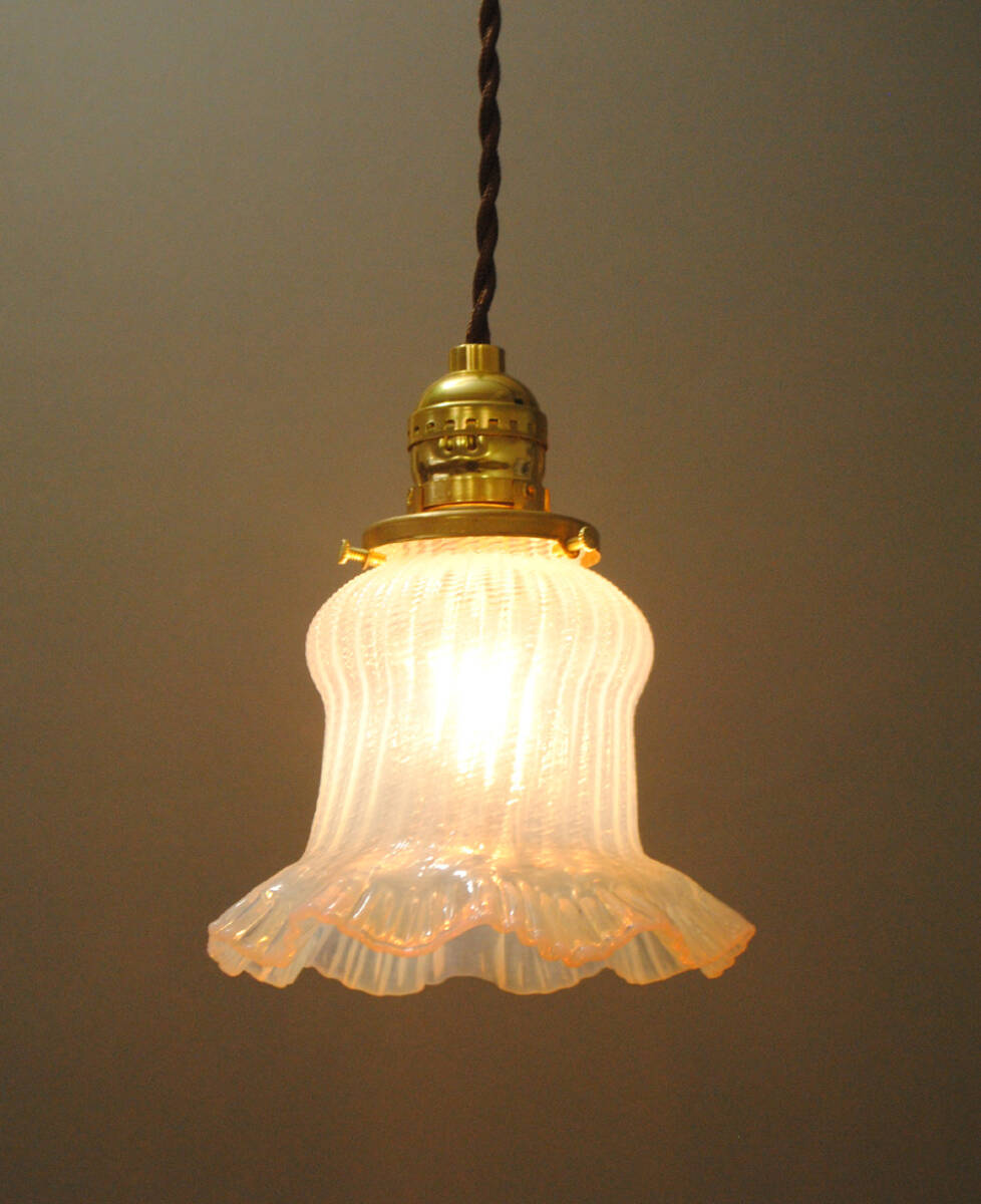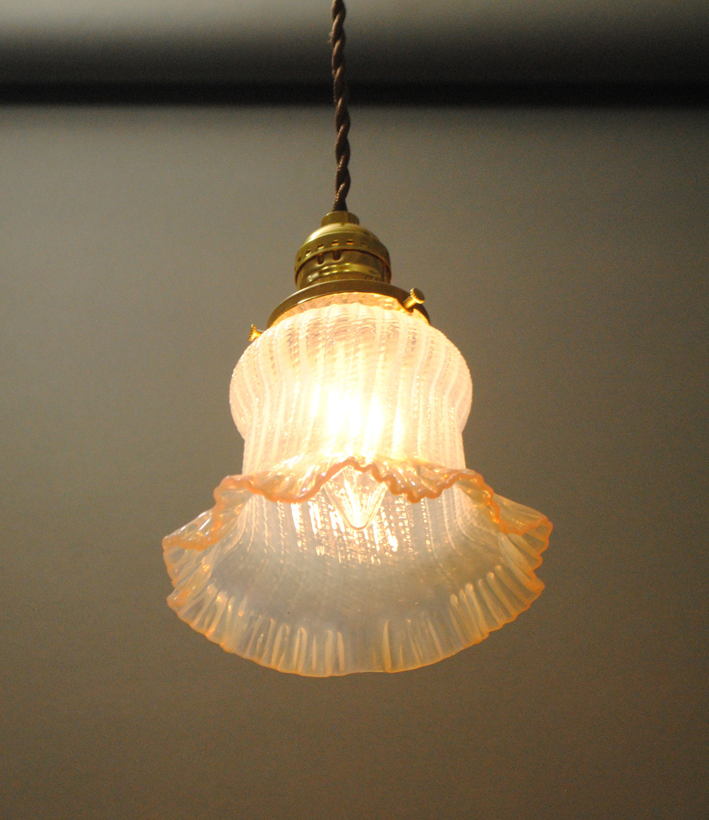 フランス・アールデコ期!!貴重,手吹きフリル造形・オパールセントガラスシェード!!コード,E26ソケット,引掛シーリング付き!!