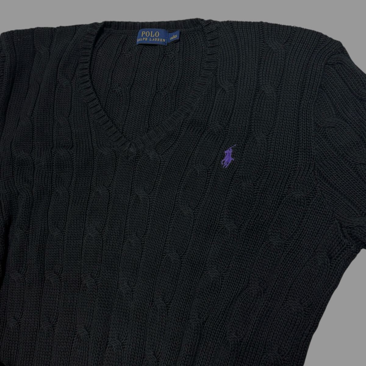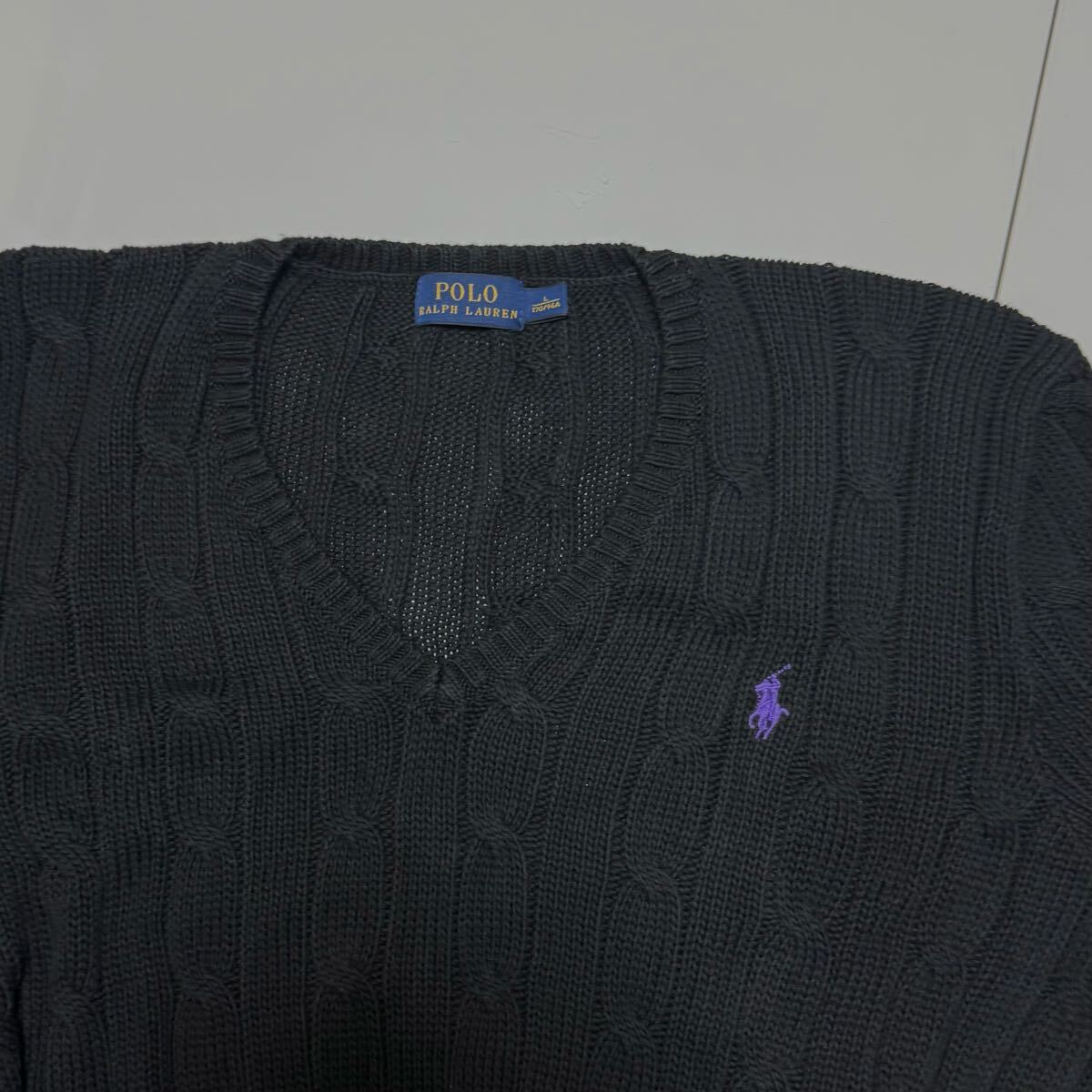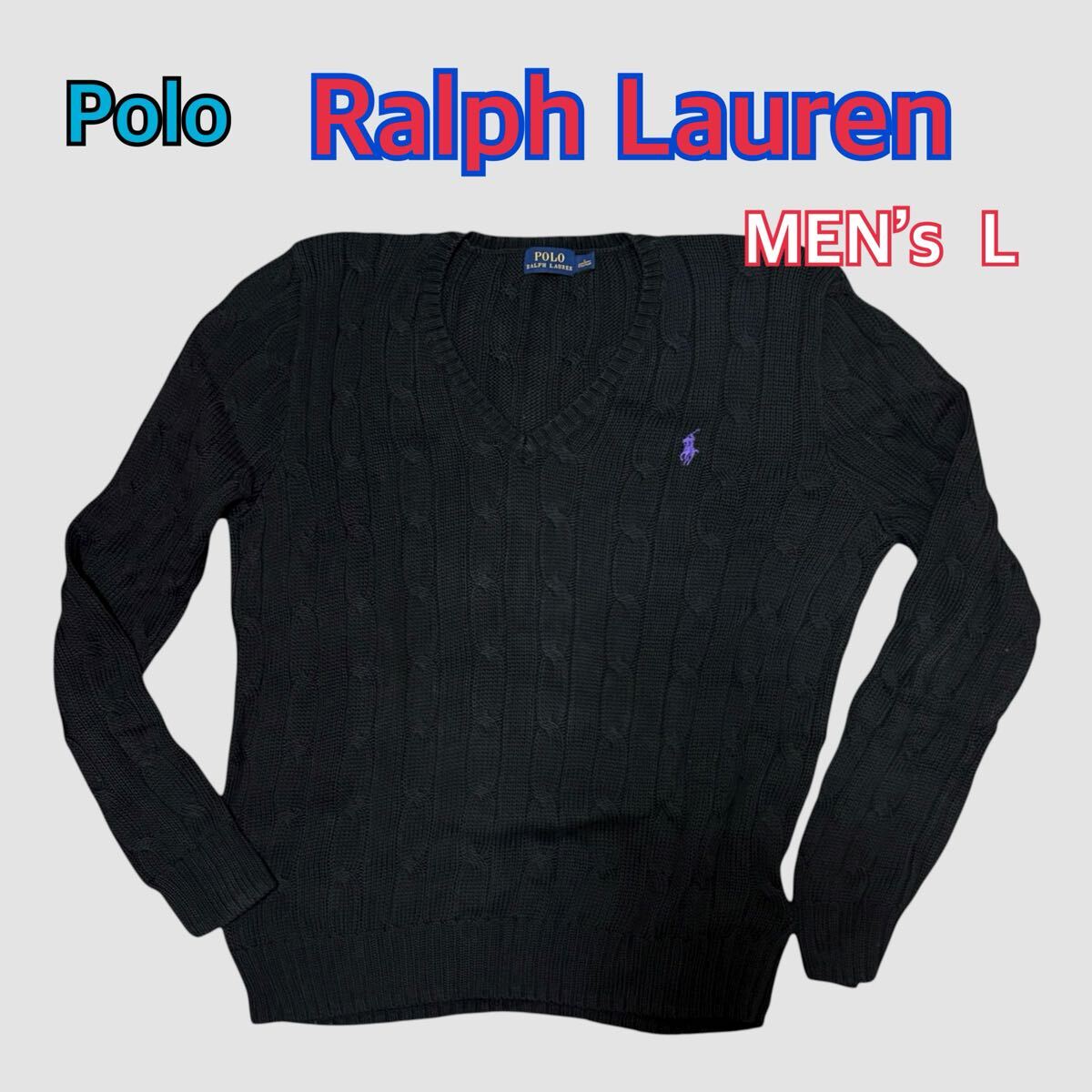 Polo Ralph Lauren ポロ ラルフローレン セーター ニット Vネック ケーブル編み ブラック 刺繍 ロゴ パープル 長袖 メンズ L