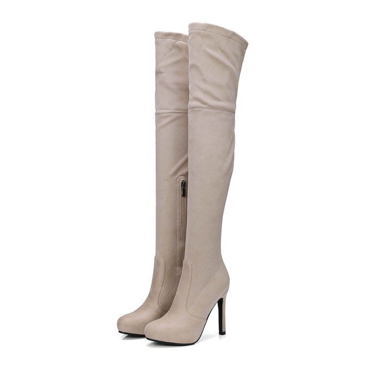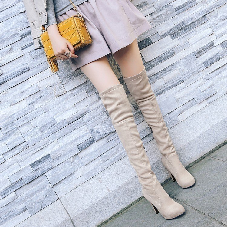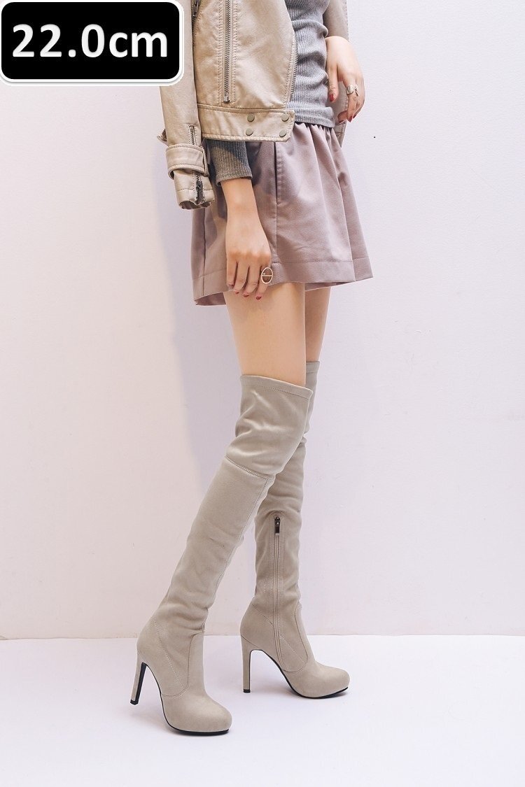 秋冬 フロック ニーハイブーツ ベージュ 22.0cm レースアップ ロングブーツ ハイヒール ブーツ 腿高 靴 美脚 新品 ☆198