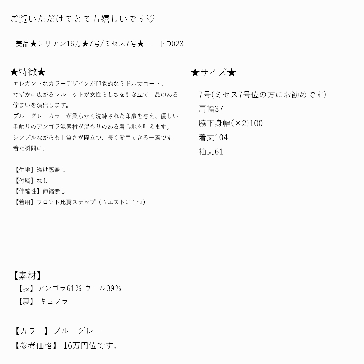 美品★レリアン16万★7号/ミセス7号★コートD023