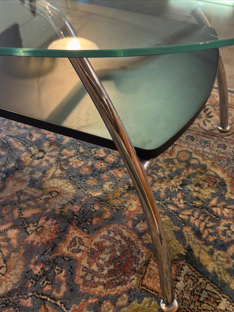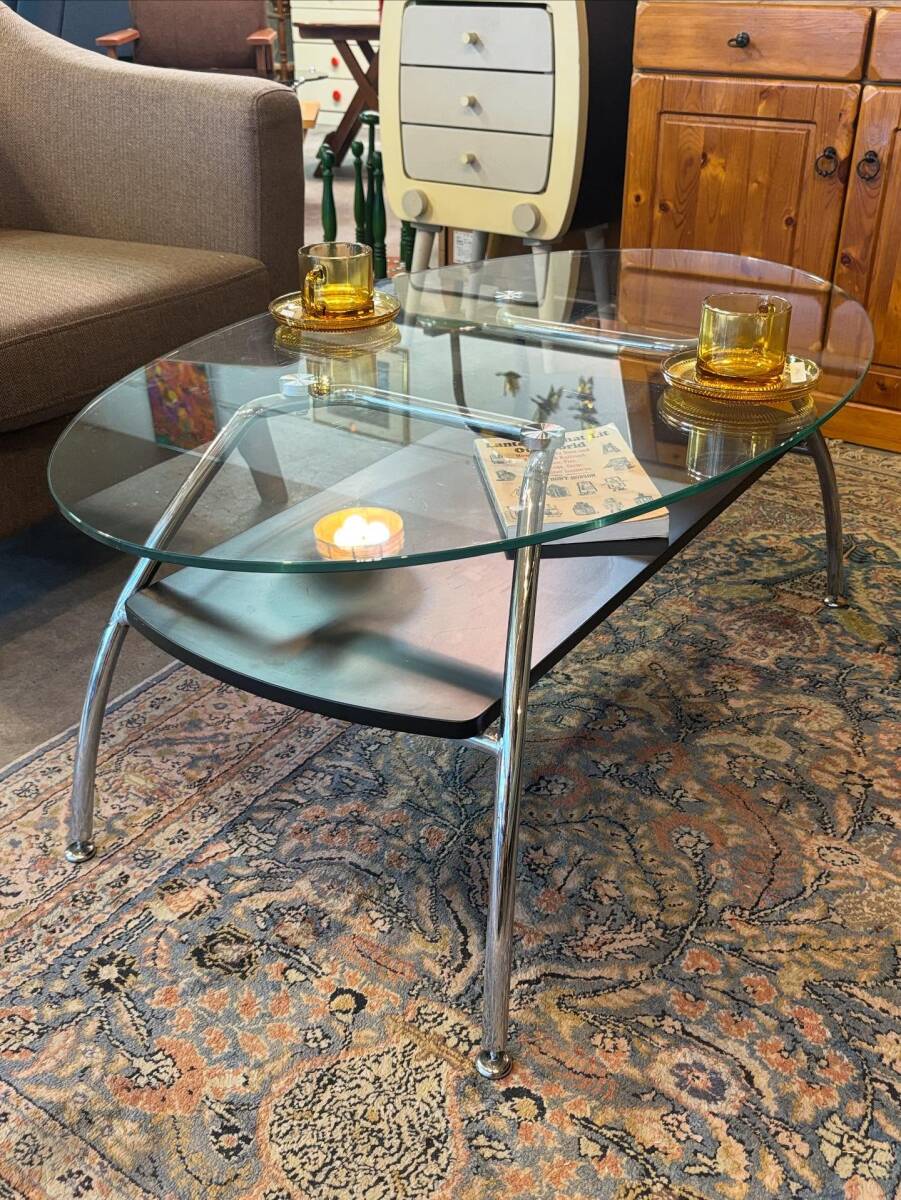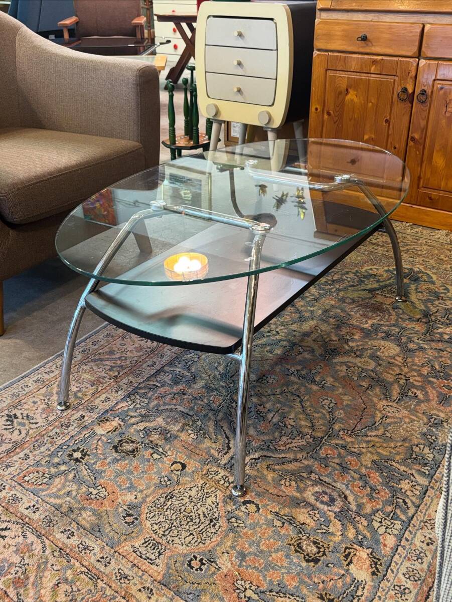 透明感あふれるガラストップのローテーブル。クロム脚との組み合わせが軽やかでモダンな印象を与え、下段棚付きで雑誌や小物収納にも便利。空間を広く見せるデザインです