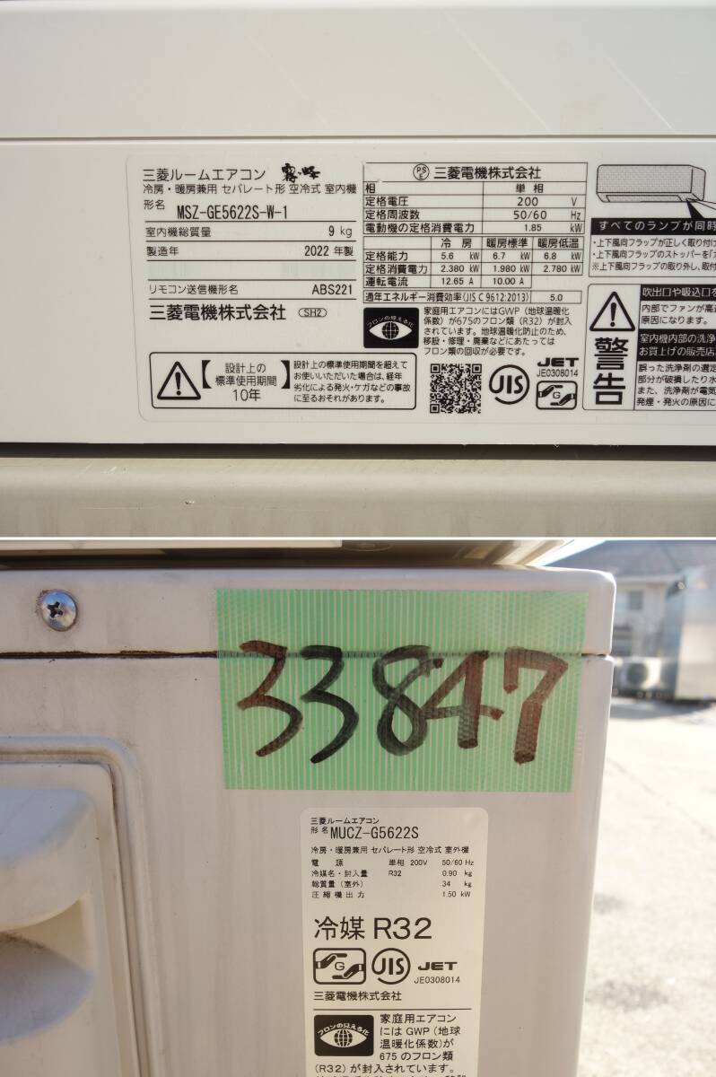 【中古】K▼三菱 ルームエアコン 2022年 5.6kw ~23畳 単相200v 霧ヶ峰 フロアアイ搭載 標準モデル コンパクトタイプ MSZ-GE5622S (33847)