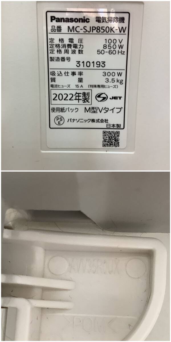 そ-1063 中古品 Panasonic MC-SJP850K-W 動作確認・簡易清掃済み 2022年製 床移動式掃除機 パナソニック
